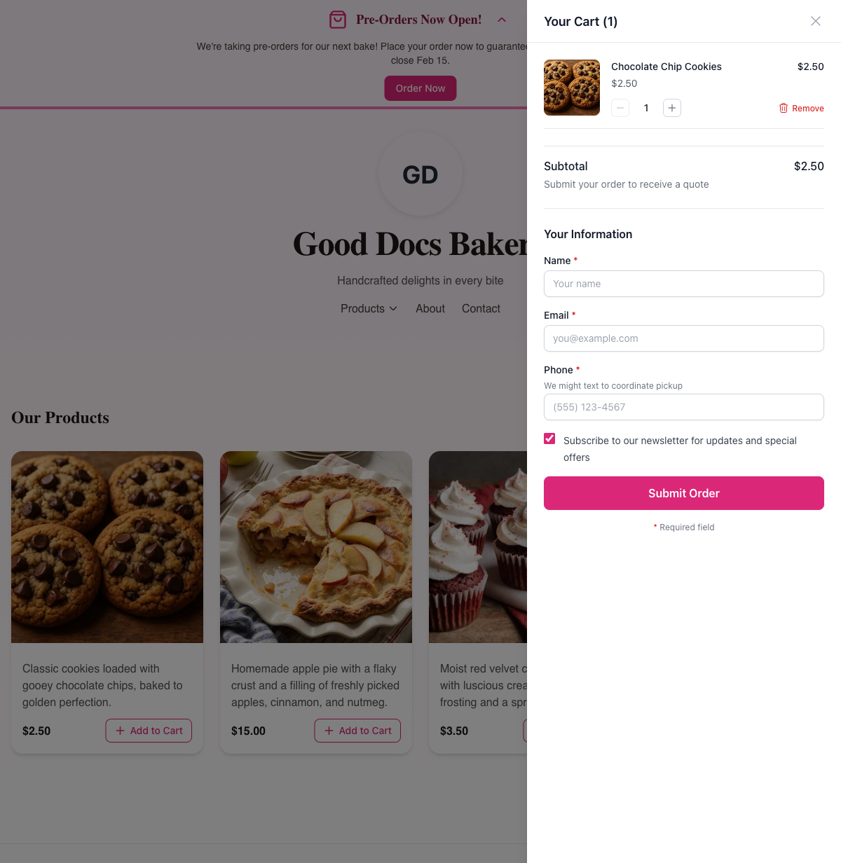 - Newsletter checkbox — Checked by default, lets customers opt in to your email updates