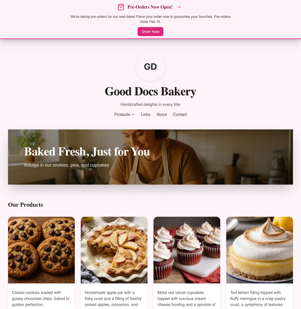 - Your bakery name and logo — Displayed prominently at the top, along with your tagline.