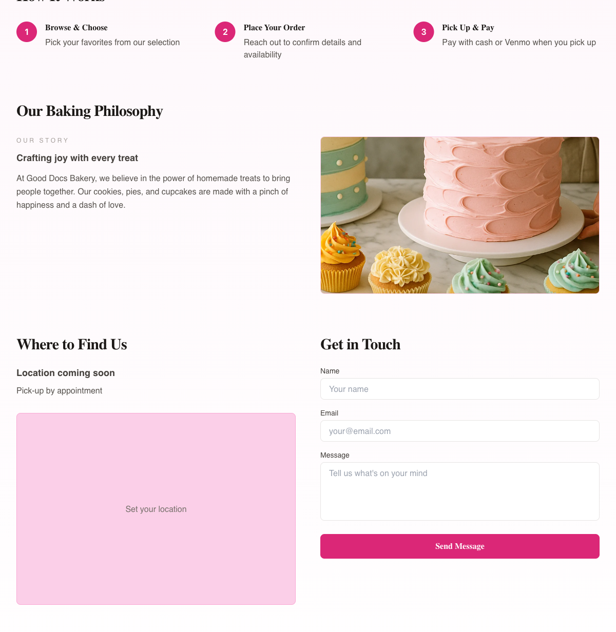 - Our Baking Philosophy — Your "About" section with your story and a photo.