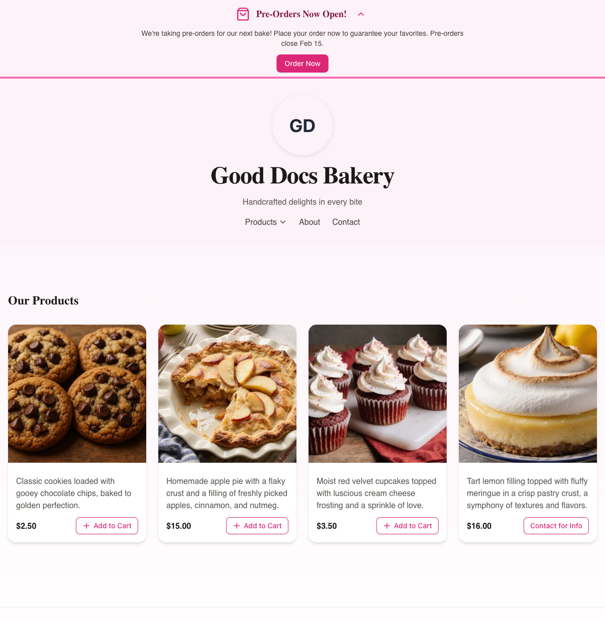 - Our Products — A grid of your products showing photos, descriptions, prices, and an Add to Cart button (or Contact for Info for inquiry-only products).
