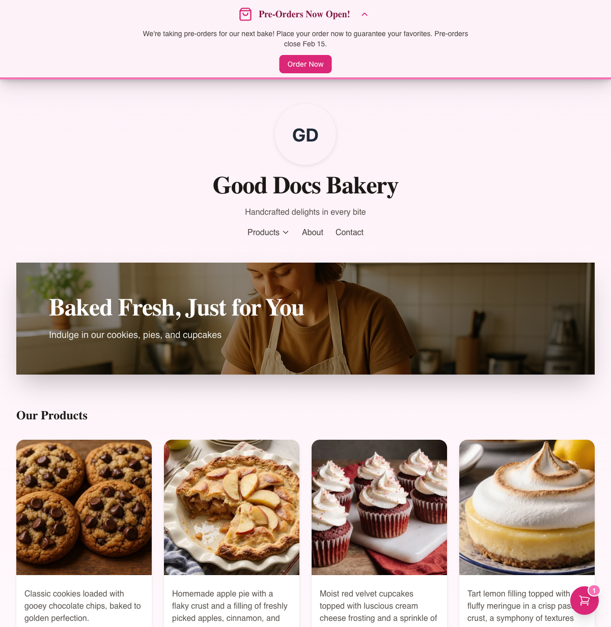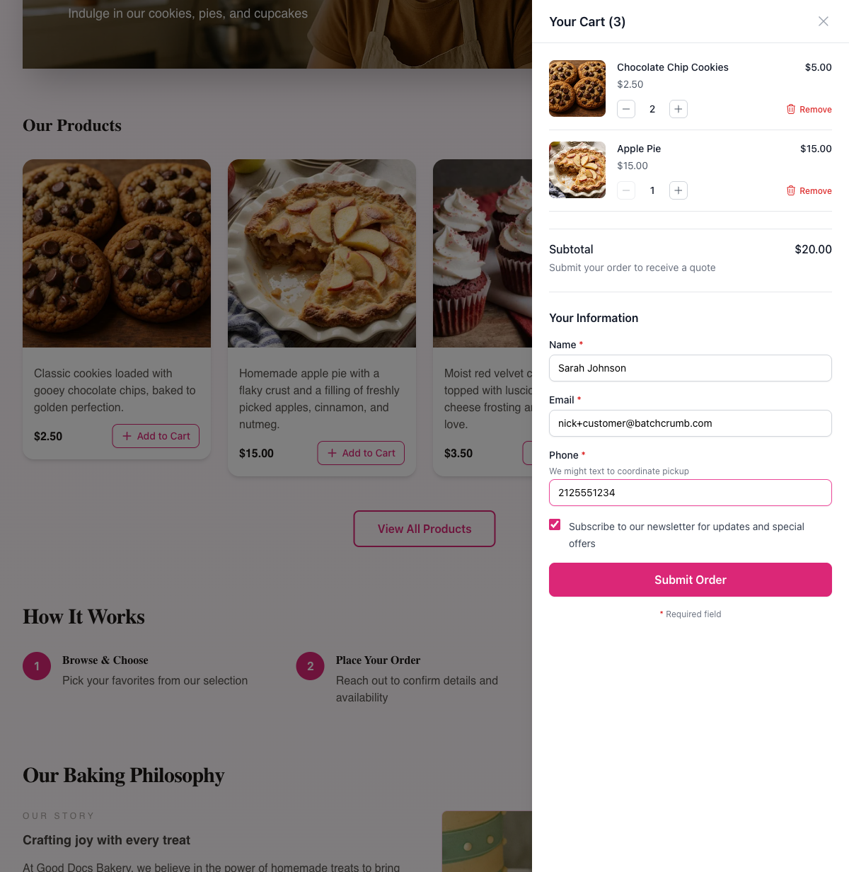 You (the baker) also receive a notification email with the customer's contact info and order details so you can follow up.