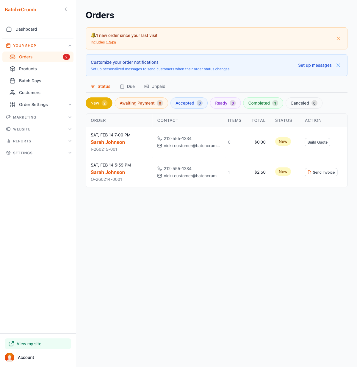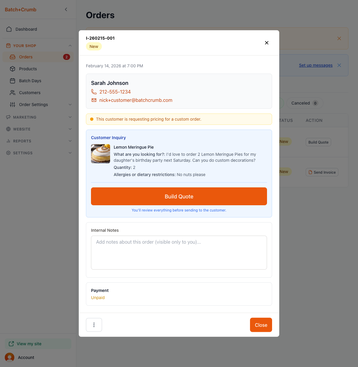 - Product inquiries show up alongside regular orders in your admin, but with a Build Quote action instead of the usual order status flow. This lets you put together custom pricing before the customer pays.