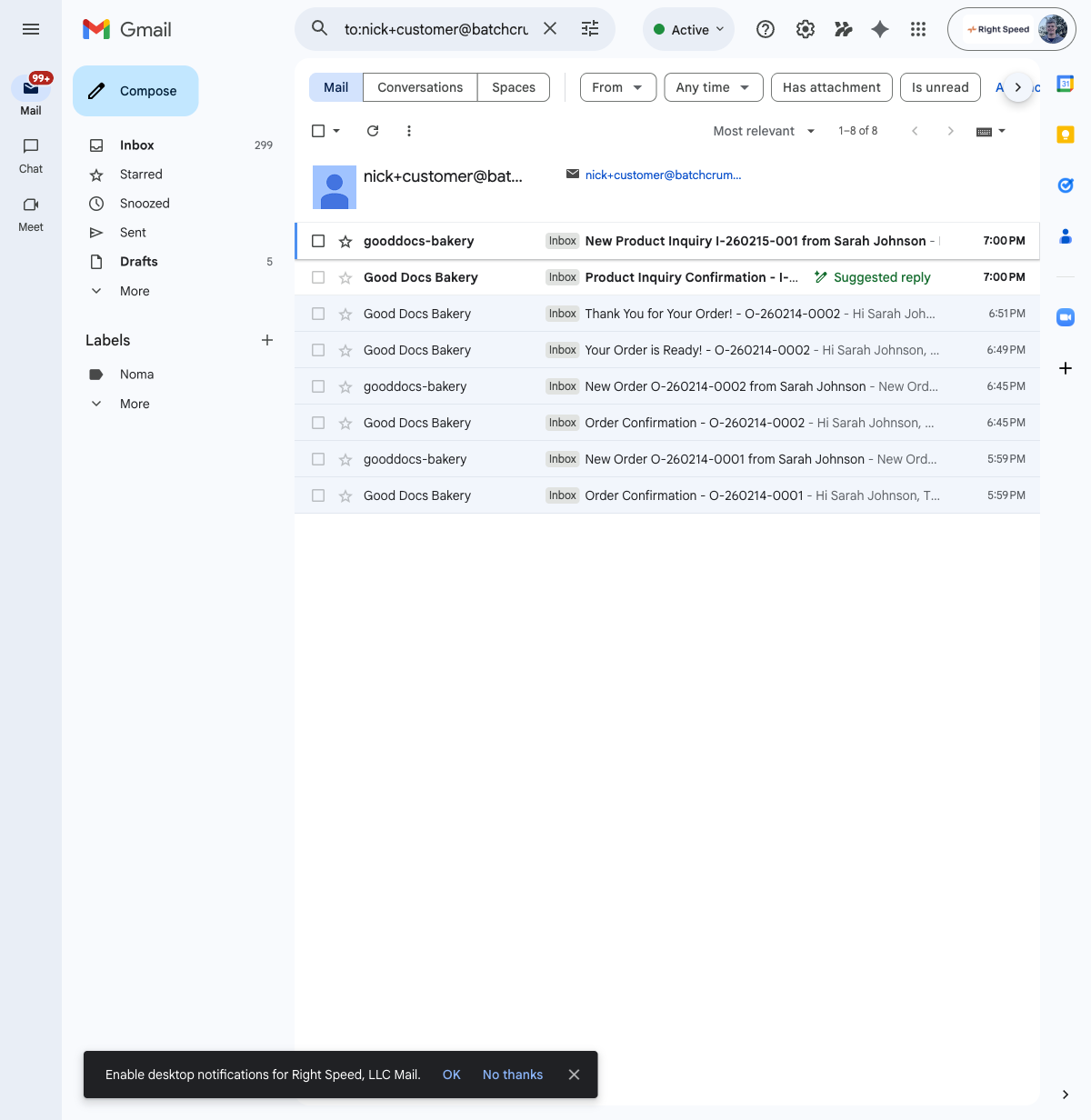 At the same time, you receive an email with the subject "New Product Inquiry [inquiry number] from [Customer Name]." This email includes: