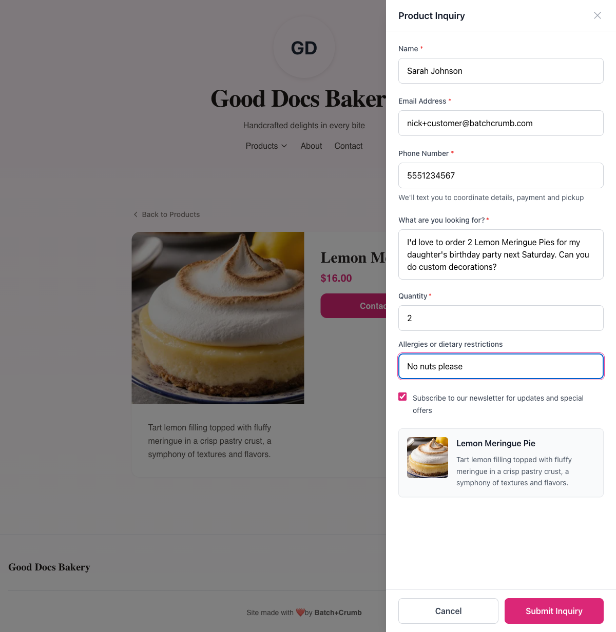 If you've set up an inquiry template for the product (like "Simple Custom Order" or "Custom Cake"), the form will also include extra fields specific to that template — things like "What are you looking for?", "Quantity", and "Allergies/dietary restrictions."
