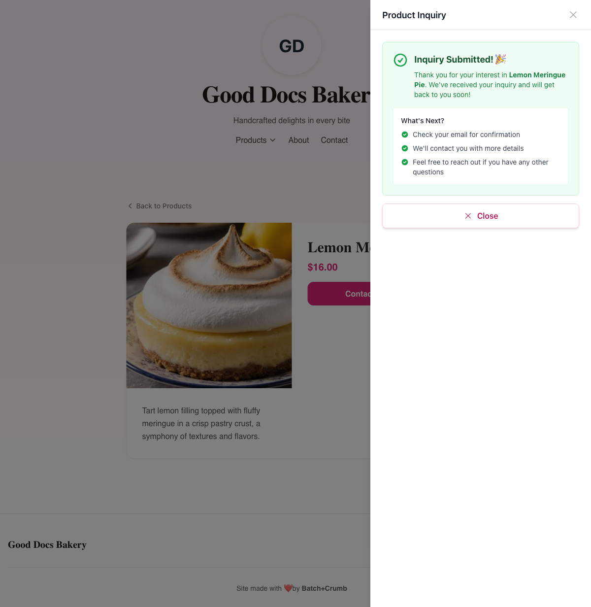 Some products aren't a simple "add to bag" situation — maybe a customer wants a custom cake for a birthday, a bulk cookie order for an event, or just has questions before committing. That's where product inquiries come in. When you set a product's call-to-action to Contact for Info, customers can fill out an inquiry form right from the product page. You'll get an email with all the details, and the inquiry shows up in your admin orders list so you can build a quote and follow up.