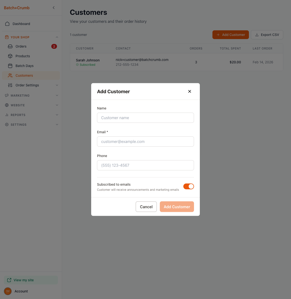 Every time someone places an order or submits an inquiry through your site, Batch52 automatically creates a customer record for them. The Customers page gives you a quick overview of everyone who's bought from you, and you can click into any customer to see their full history. You can also add customers manually if you need to.