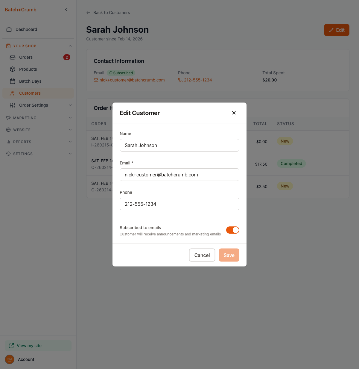 - Customer — Their name and email subscription status. A green "Subscribed" badge means they'll receive your announcements and marketing emails.