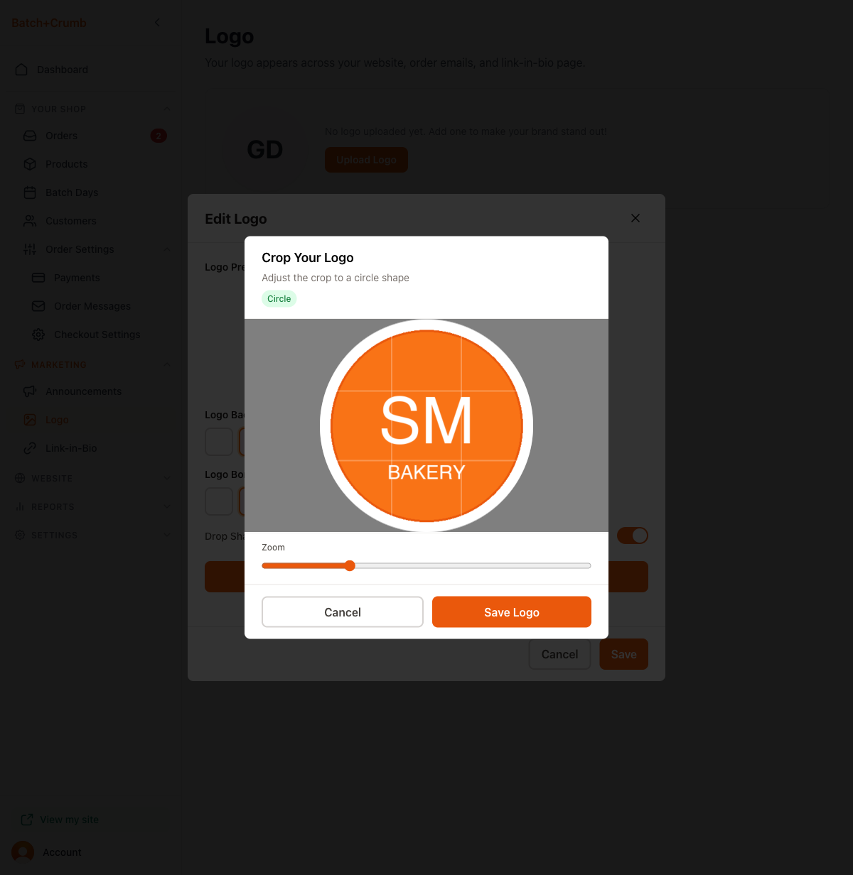 Click the orange Upload Logo button. This opens the Edit Logo dialog, which shows a preview of your logo (or the initials placeholder) along with styling options: