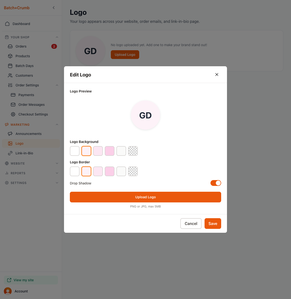 Back in the Edit Logo dialog, you'll see your uploaded logo in the preview. You can now adjust the background color, border color, and drop shadow if you'd like. The preview updates in real time so you can see how each option looks.