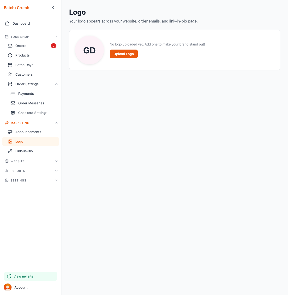 In the sidebar, click Marketing to expand the section, then click Logo. If you haven't uploaded a logo yet, you'll see your initials in a circle with a message: "No logo uploaded yet. Add one to make your brand stand out!"