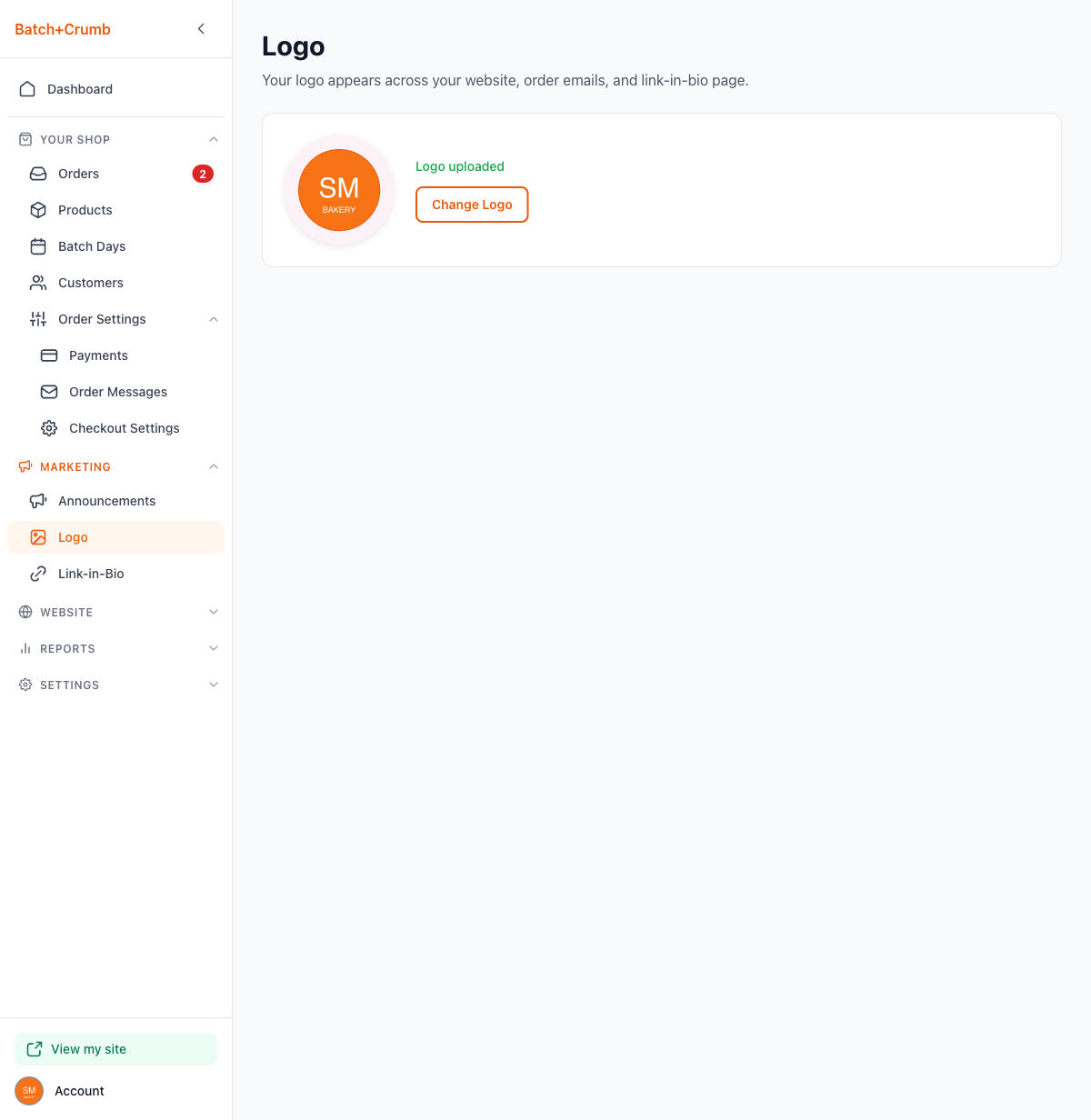 - Your logo appears on your public website header, in order confirmation and status update emails, and on your link-in-bio page — so pick something that looks good at a small size.