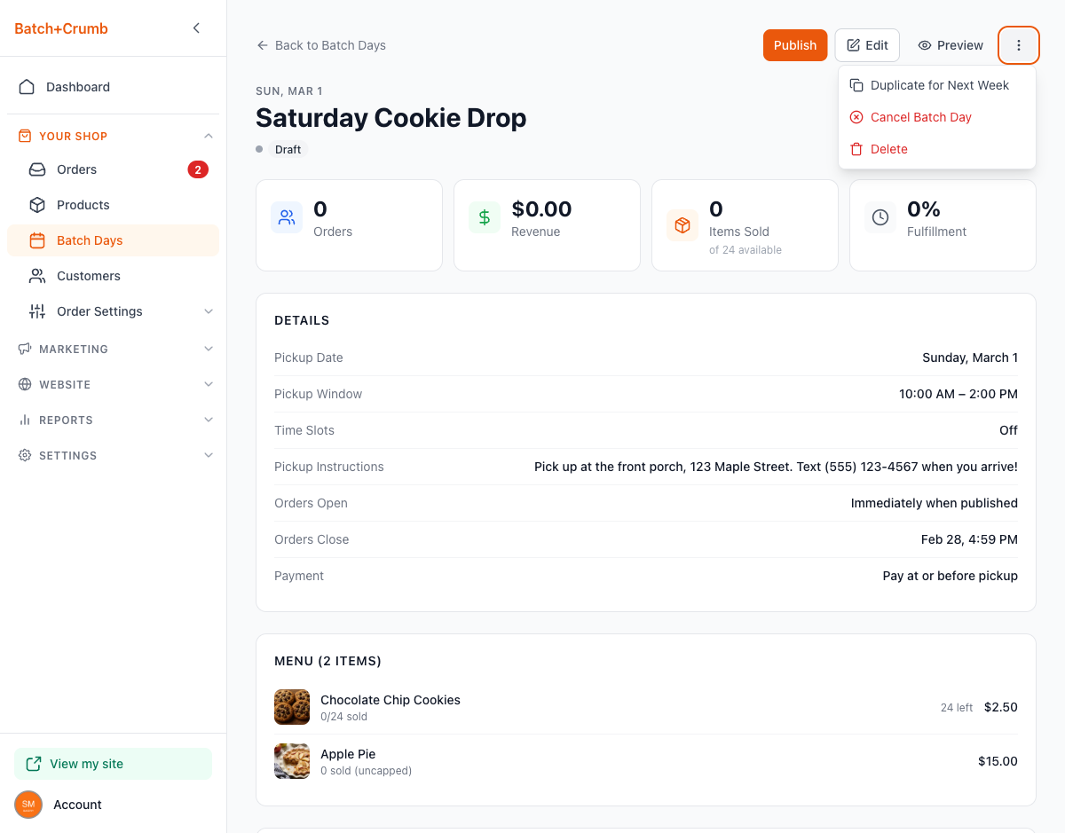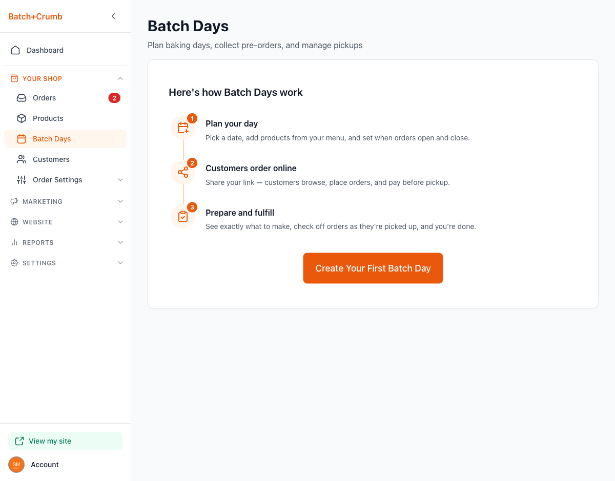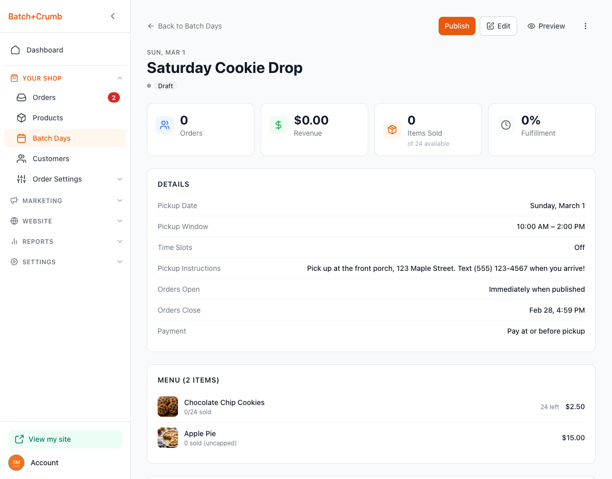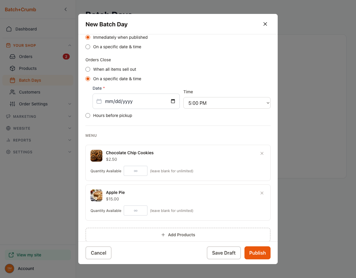 Batch Days let you plan baking days around your schedule. You pick a date, choose which products to offer, set when orders open and close, and share the link. Customers place their orders online before the pickup day, so you know exactly what to bake — no guessing, no waste.