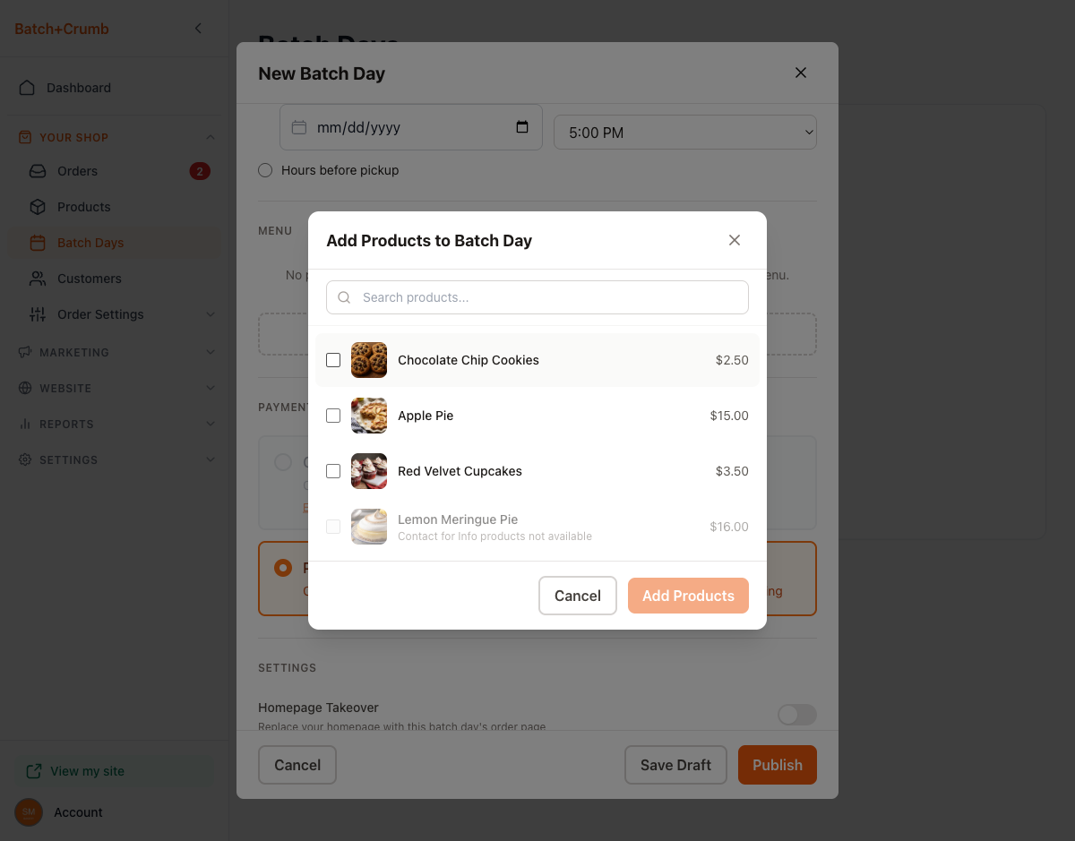 Click + Add Products to choose which items to offer for this batch day. You'll see a list of all your products with checkboxes. Select the ones you want, then click Add Products.