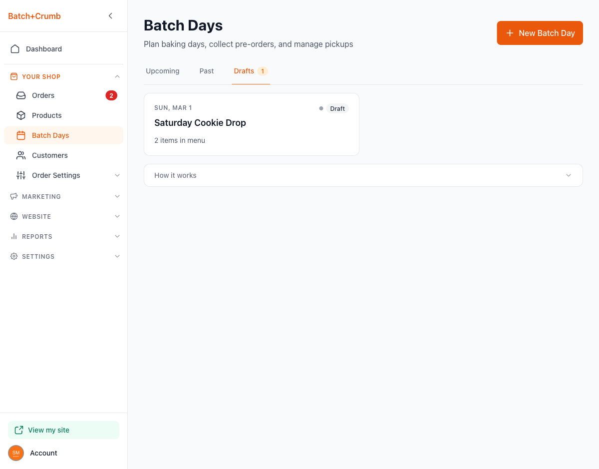 - Drafts — Saved batch days that haven't been published yet.