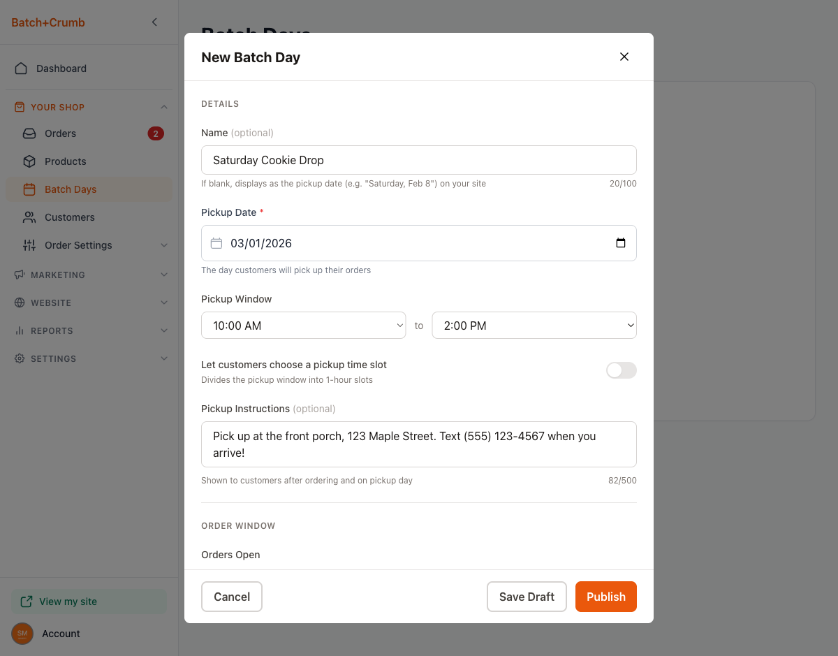 - Name (optional) — Give your batch day a fun name like "Saturday Cookie Drop" or "Valentine's Day Treats." If you leave it blank, it will display as the pickup date (e.g., "Saturday, Feb 8") on your site.