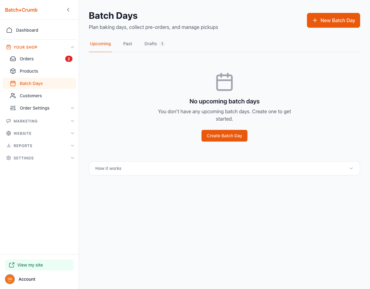 From the left sidebar, click Batch Days under Your Shop. If you haven't created any batch days yet, you'll see an overview explaining how it works in three steps: