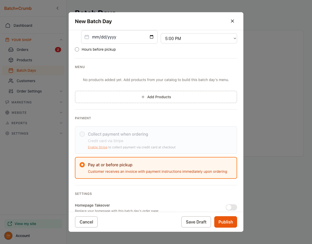 - Homepage Takeover — Toggle this on to replace your homepage with this batch day's order page. This is great when you want all traffic going straight to your upcoming batch day.