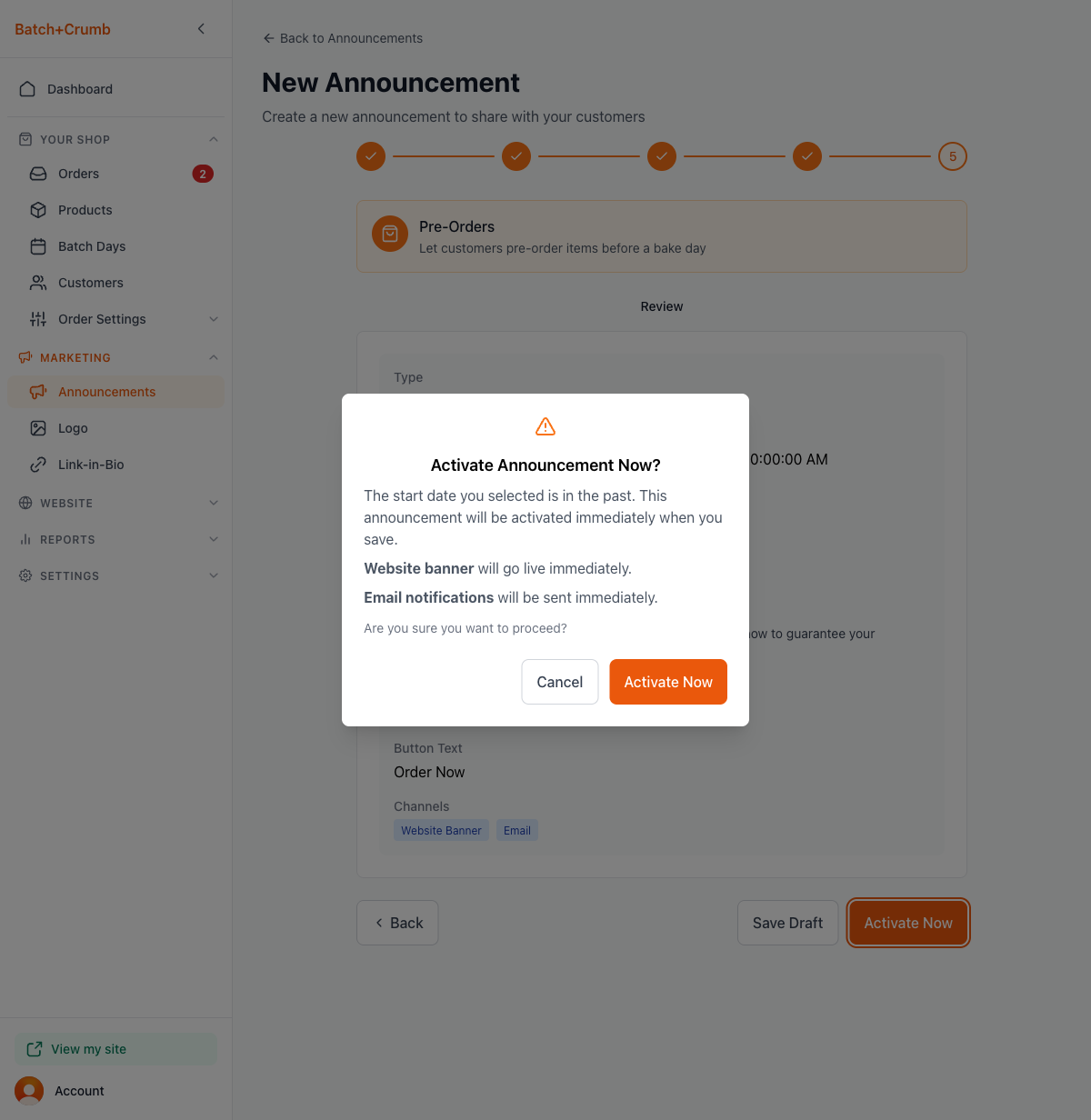 If you choose to activate immediately, you'll see a confirmation dialog letting you know the banner will go live and emails will be sent right away.