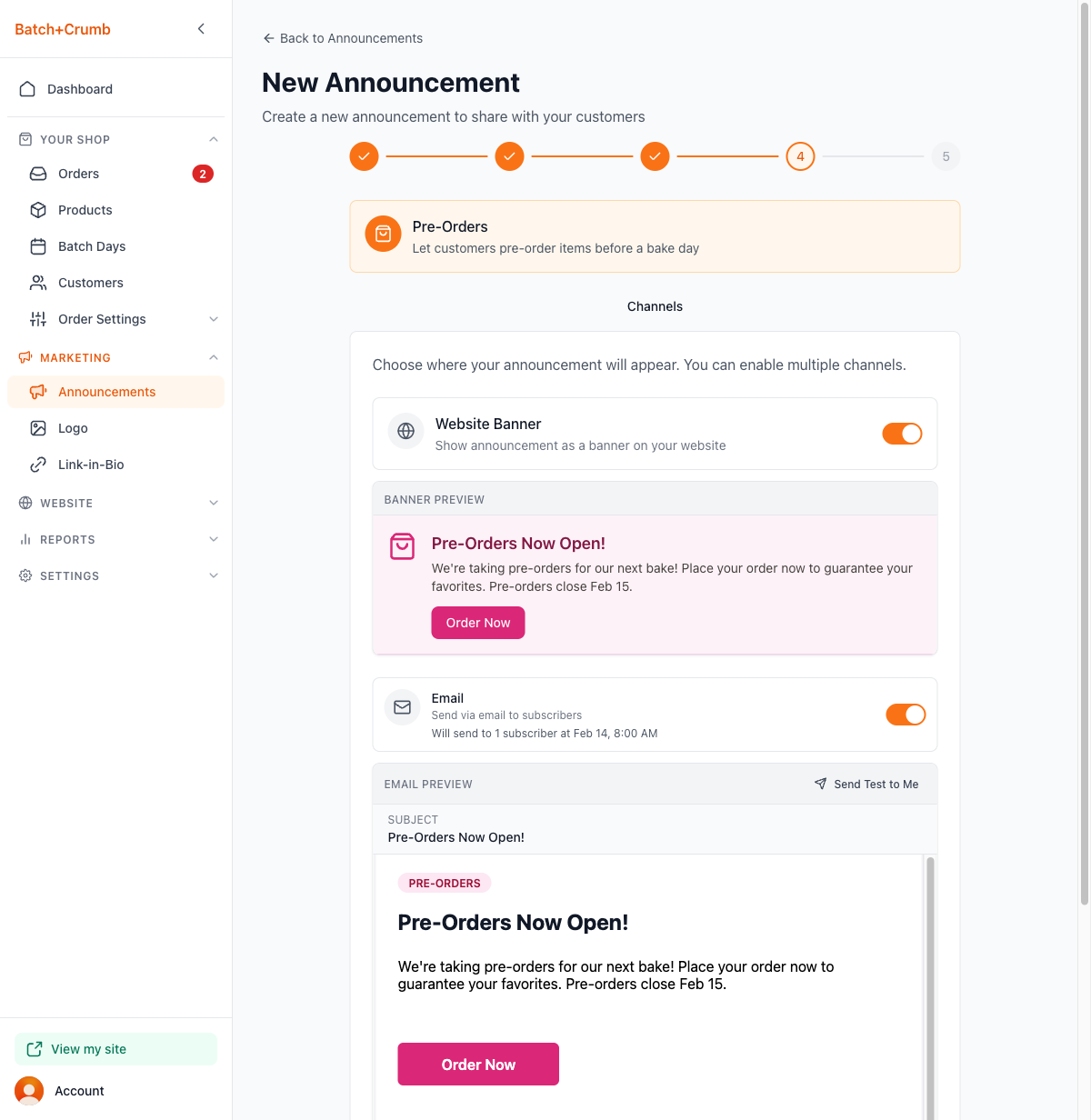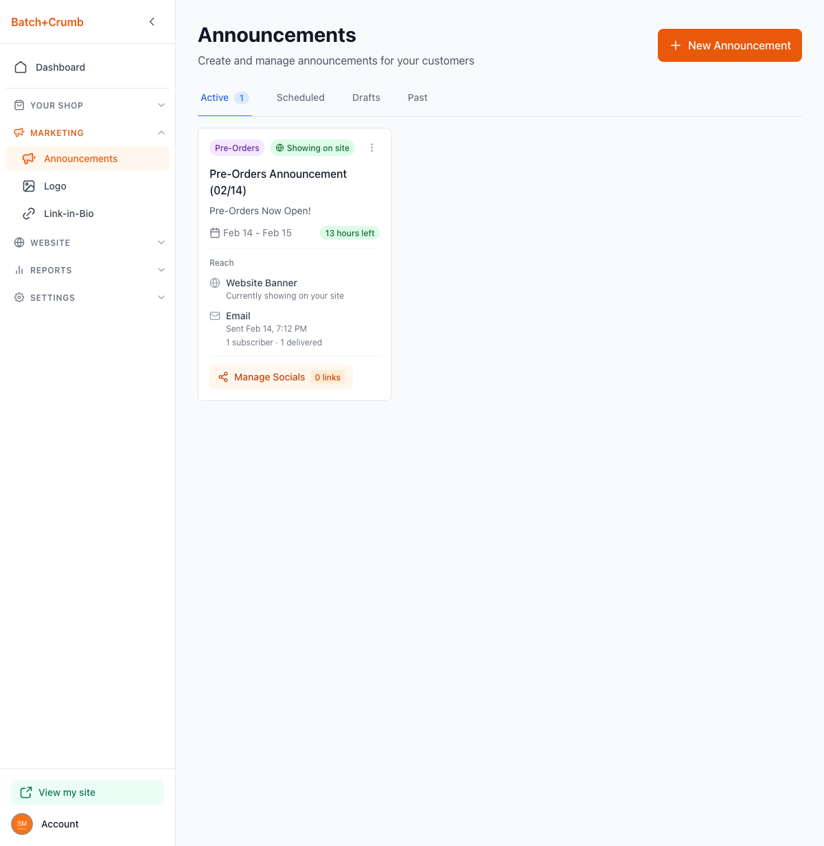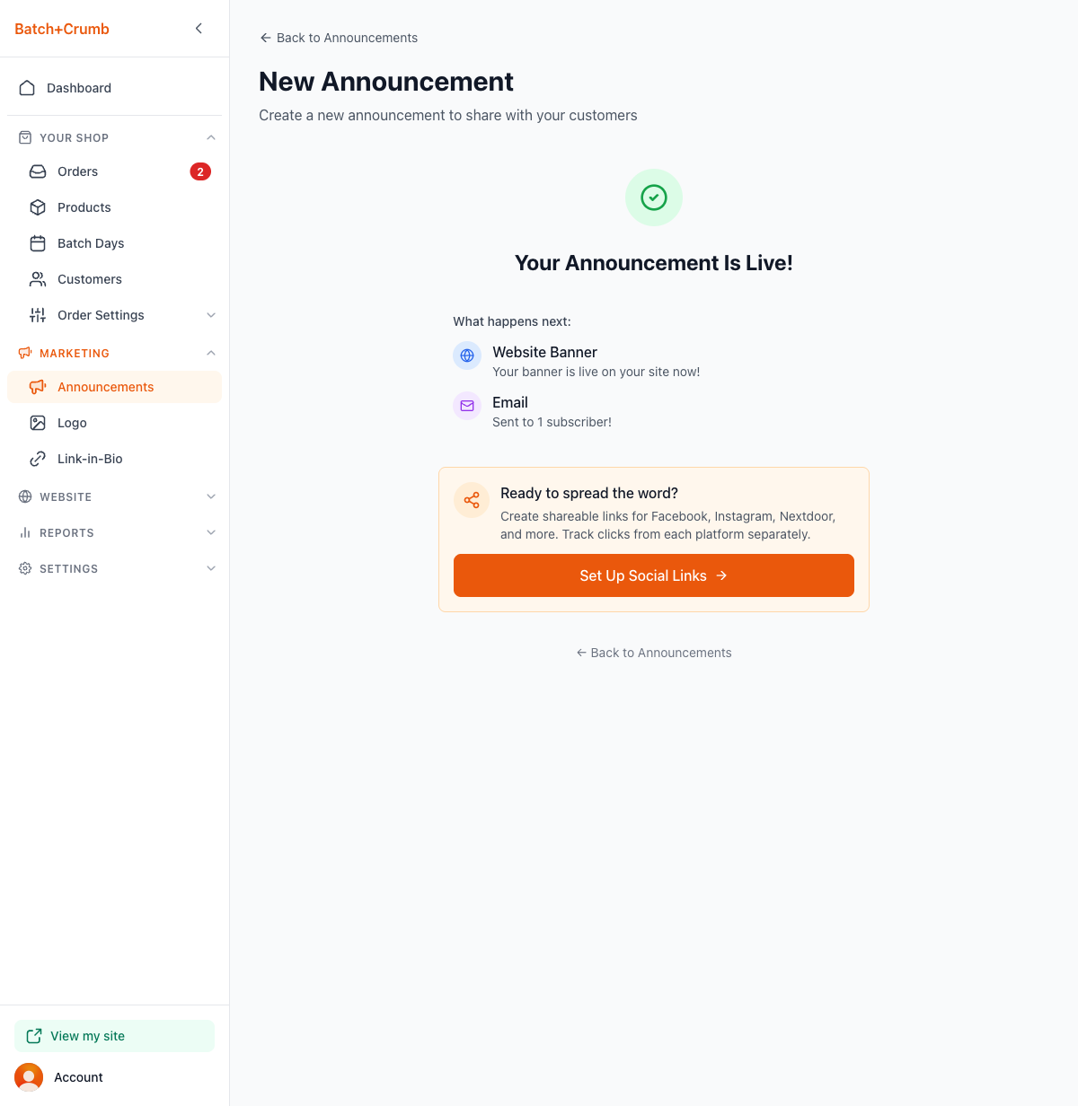Announcements are a great way to get the word out when you have something exciting to share — whether you're opening pre-orders for this weekend's bake, announcing fresh stock at your farmstand, or promoting an upcoming market appearance. You can display a banner right on your website, and if you're on the Pro plan, send an email blast to your subscribers too.