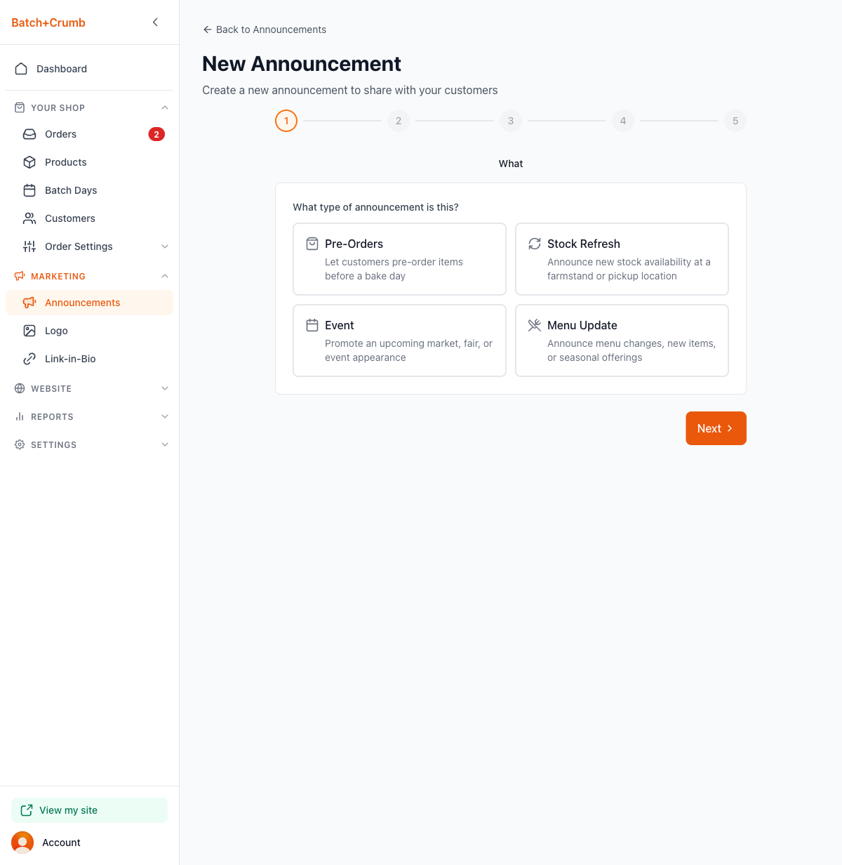 3. Choose your announcement type (Step 1)