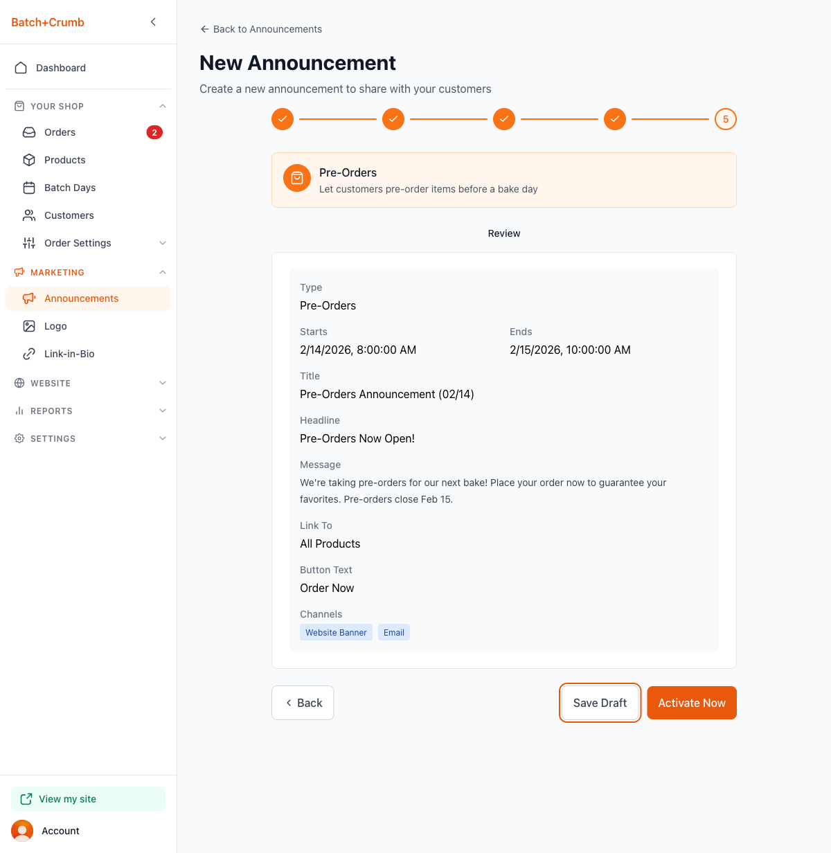 The final step shows a summary of everything — your type, dates, headline, message, link, and channels. Review it all, then choose: