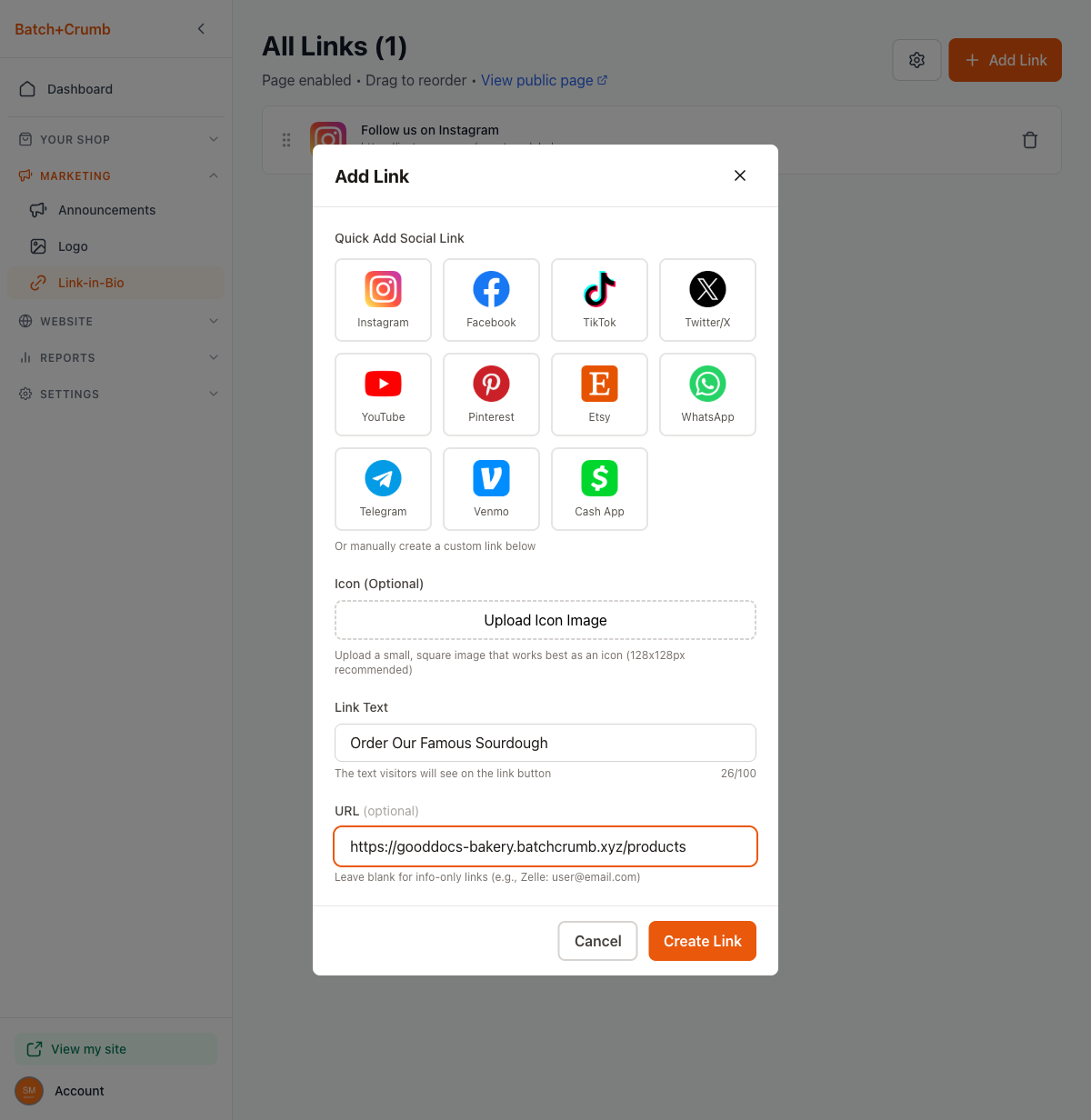 - Enter the URL — or leave it blank for info-only links (e.g., "Zelle: mybakery@email.com")
