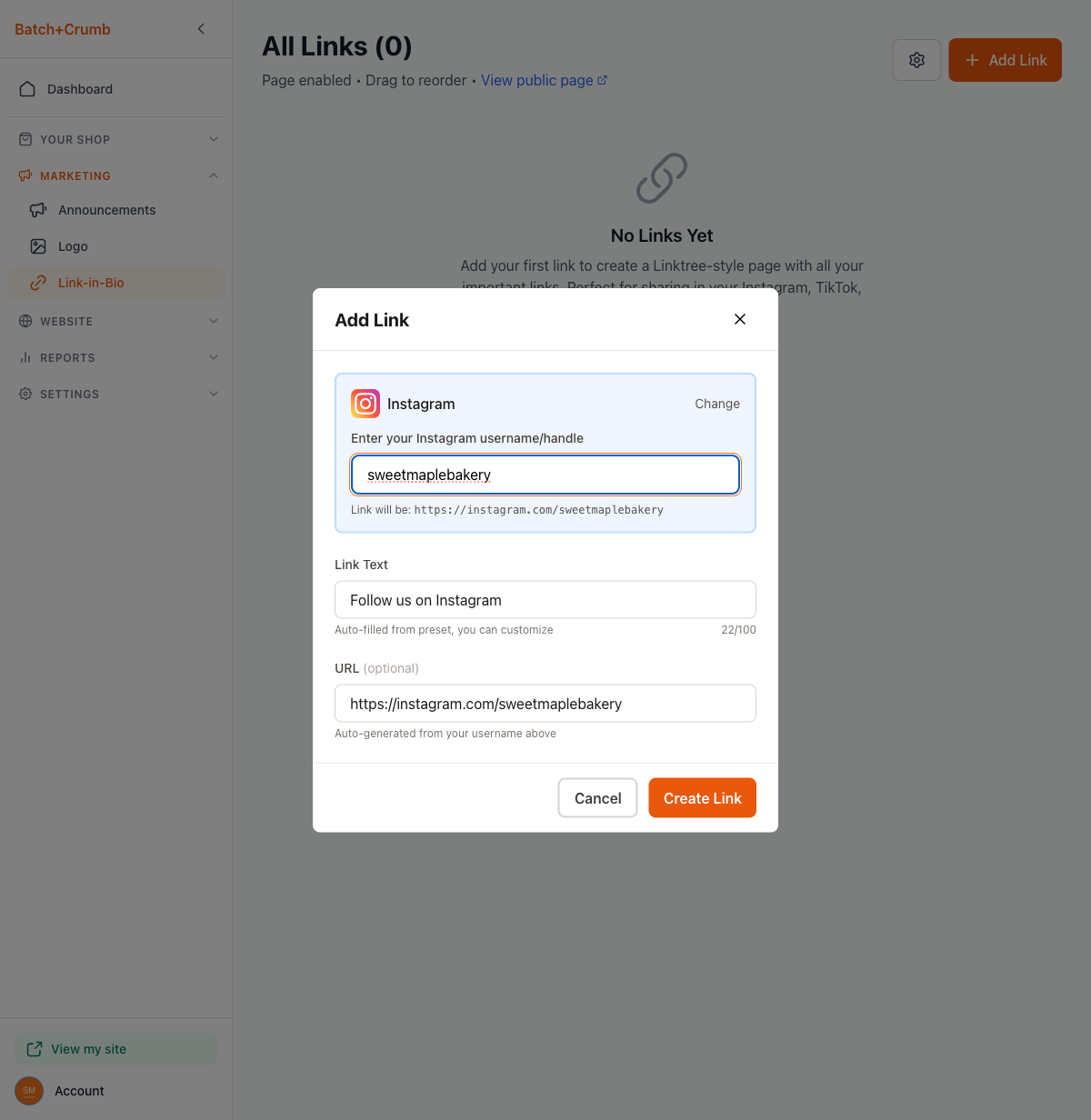 - Enter your username or handle — the URL is generated automatically