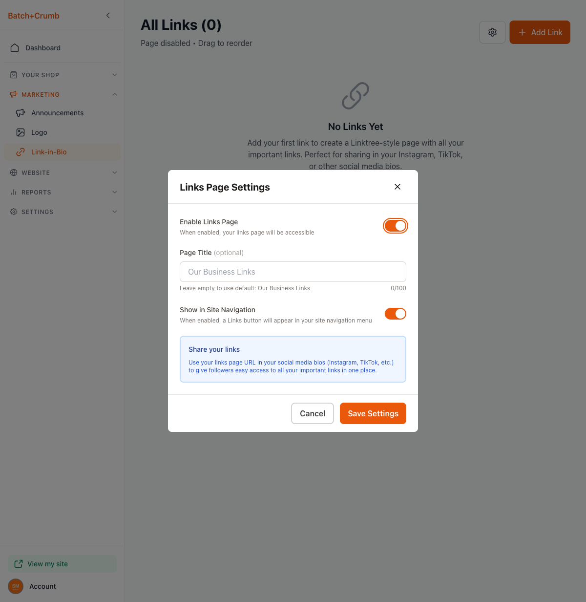 Your links page lives at a URL like yourbusiness.batch52.com/links. Copy this URL and paste it into: