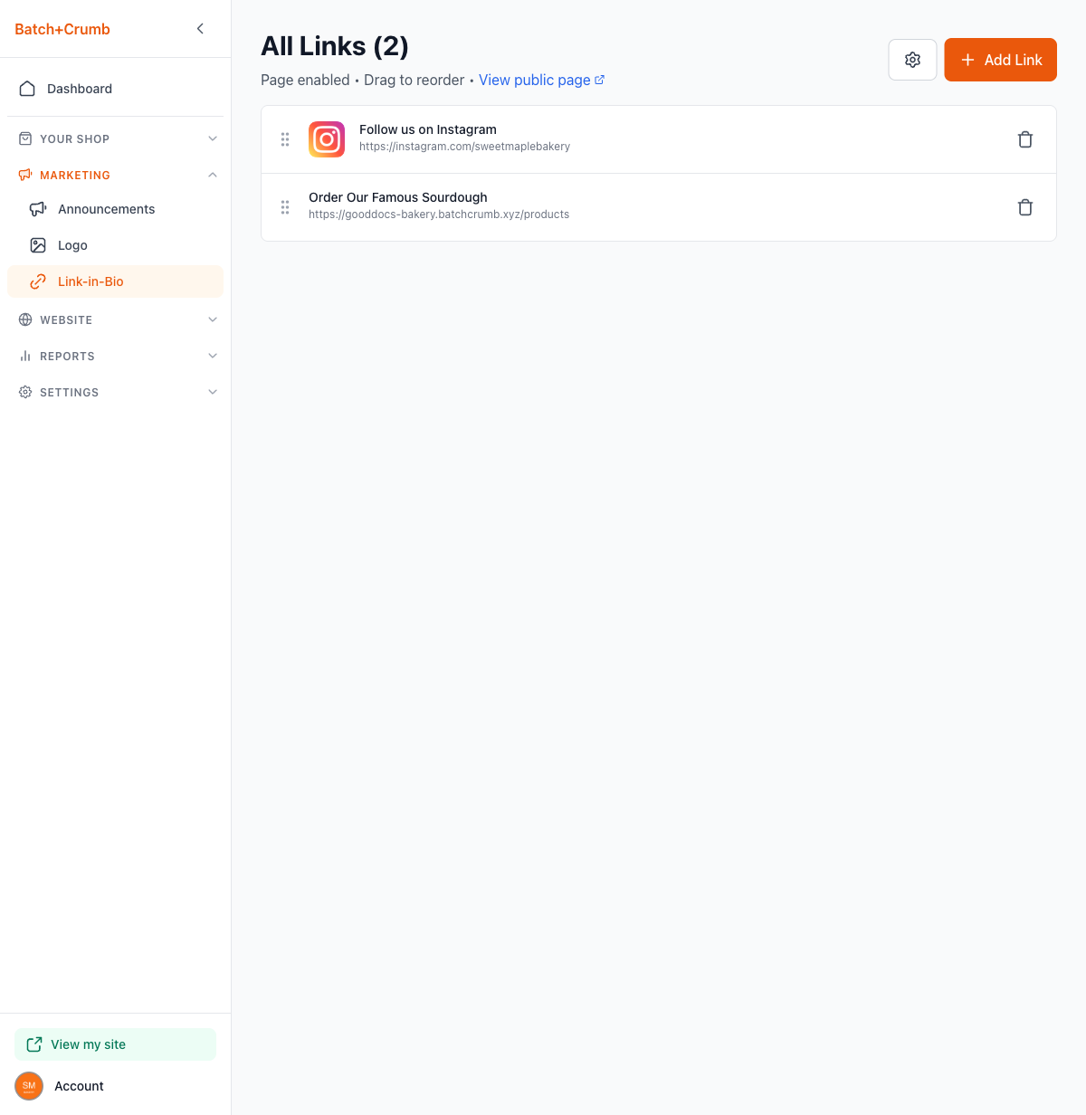Once you have links added, they appear in a list on the Link-in-Bio page. From here you can: