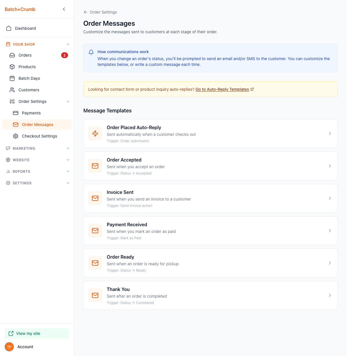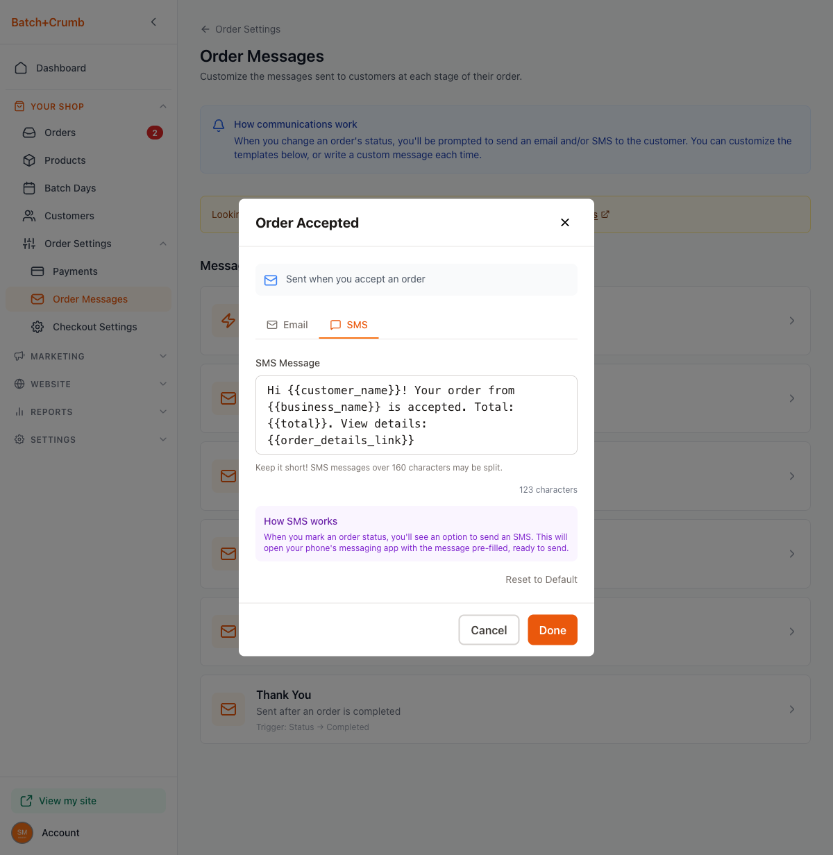 Every time you accept an order, mark it ready, or complete it, Batch52 can send your customer an email or SMS letting them know. The Order Messages page lets you customize what those messages say — so they sound like you, not a generic robot. You can tweak the subject lines, body text, and SMS wording for each stage of the order process.