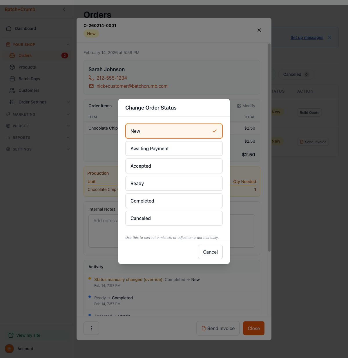 - You bake it and mark it ready — status moves to Ready (customer gets notified)