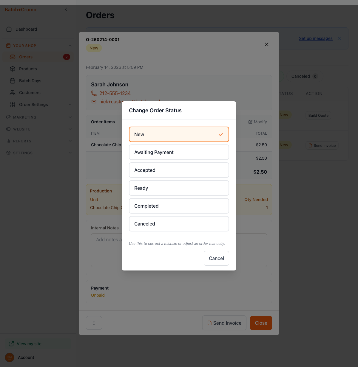 As you work through your orders, you'll want to update their status so you (and your customers) know where things stand. Batch52 gives you two ways to do this: quick-action buttons that guide you through the natural flow, or a manual Change Status option when you need to jump to a specific status. Each status change can optionally send your customer an email or text message to keep them in the loop.