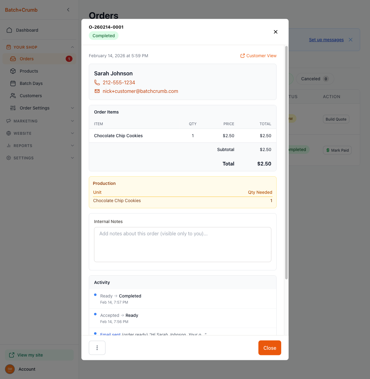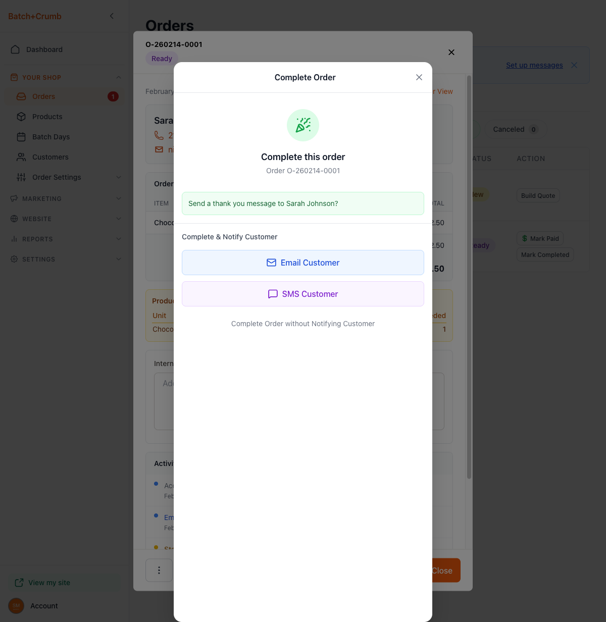When the customer picks up their order, click Mark Completed. You'll see the same notification options — send a thank you email, a text, or just mark it done quietly.