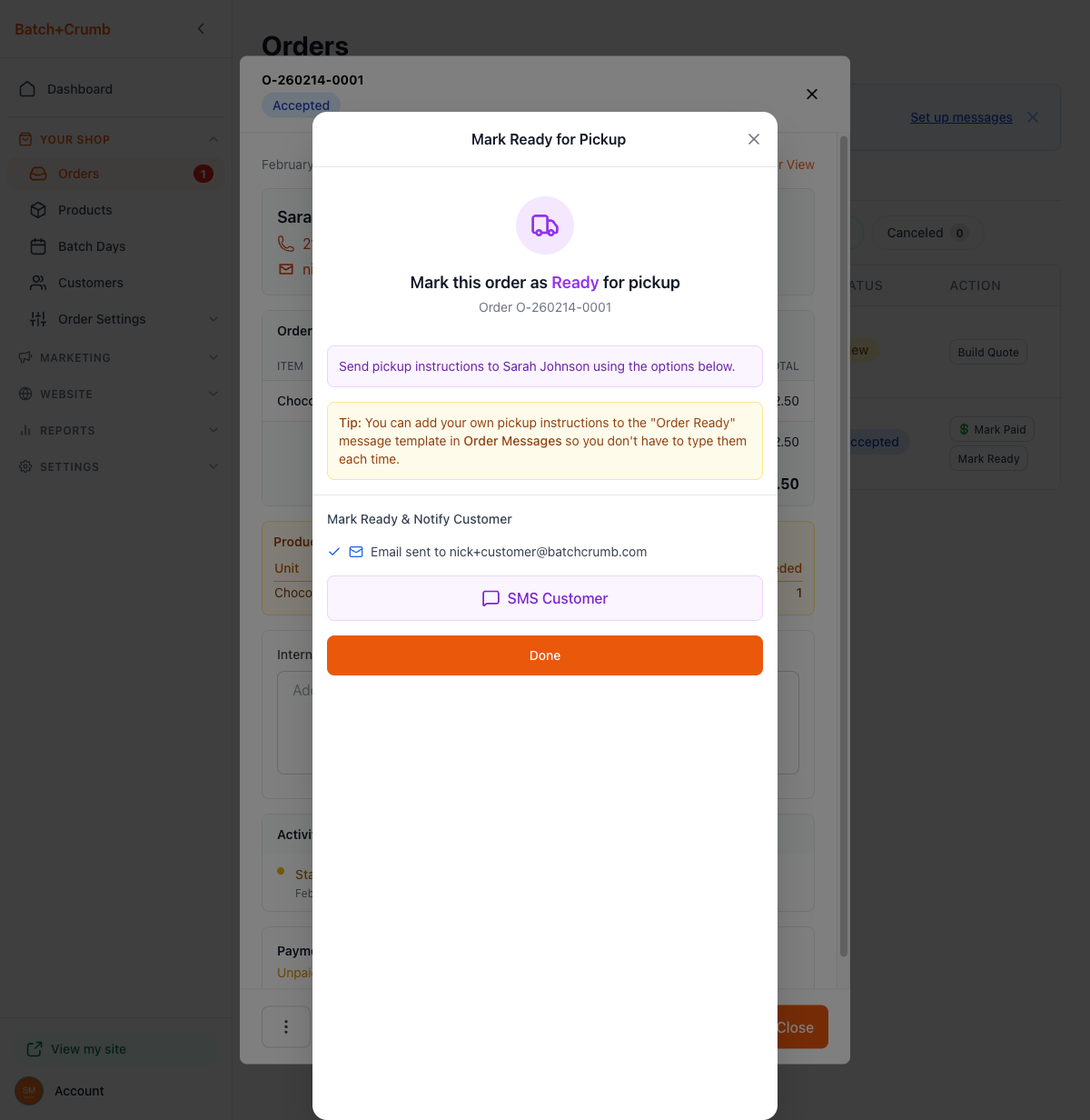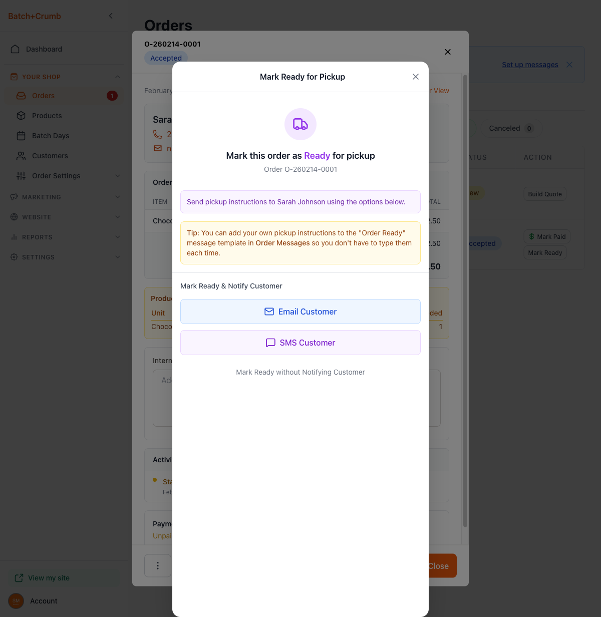 When you click Mark Ready or Mark Completed, a dialog pops up asking if you'd like to notify your customer. You have three options: