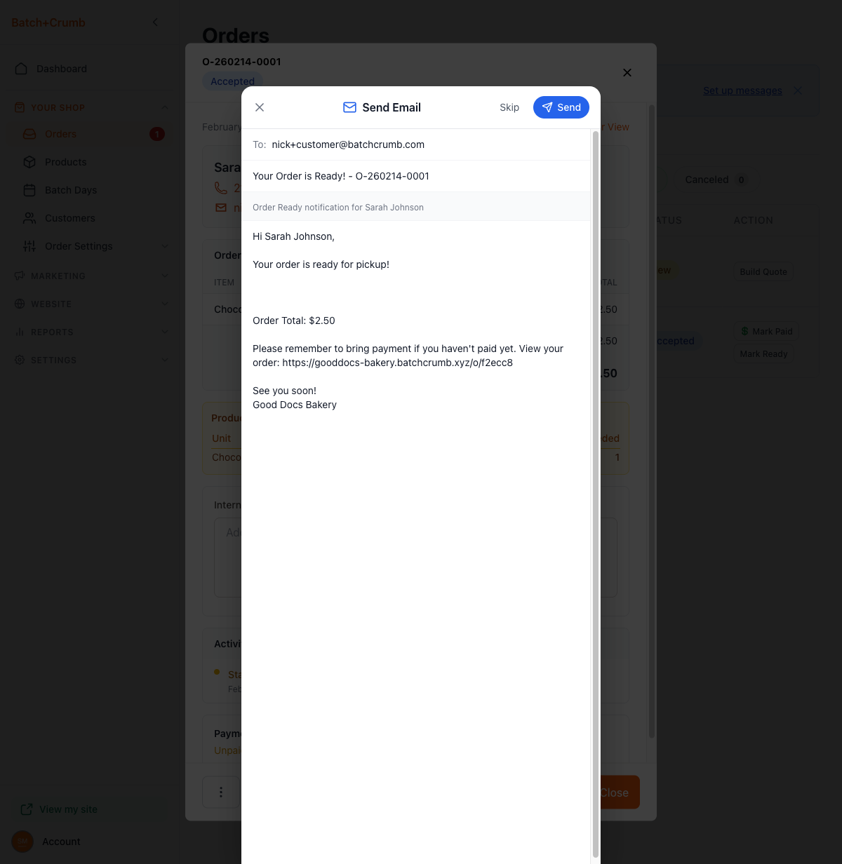 When you send a status notification email, your customer receives a message from your bakery name with the order details and a link to view their order online.