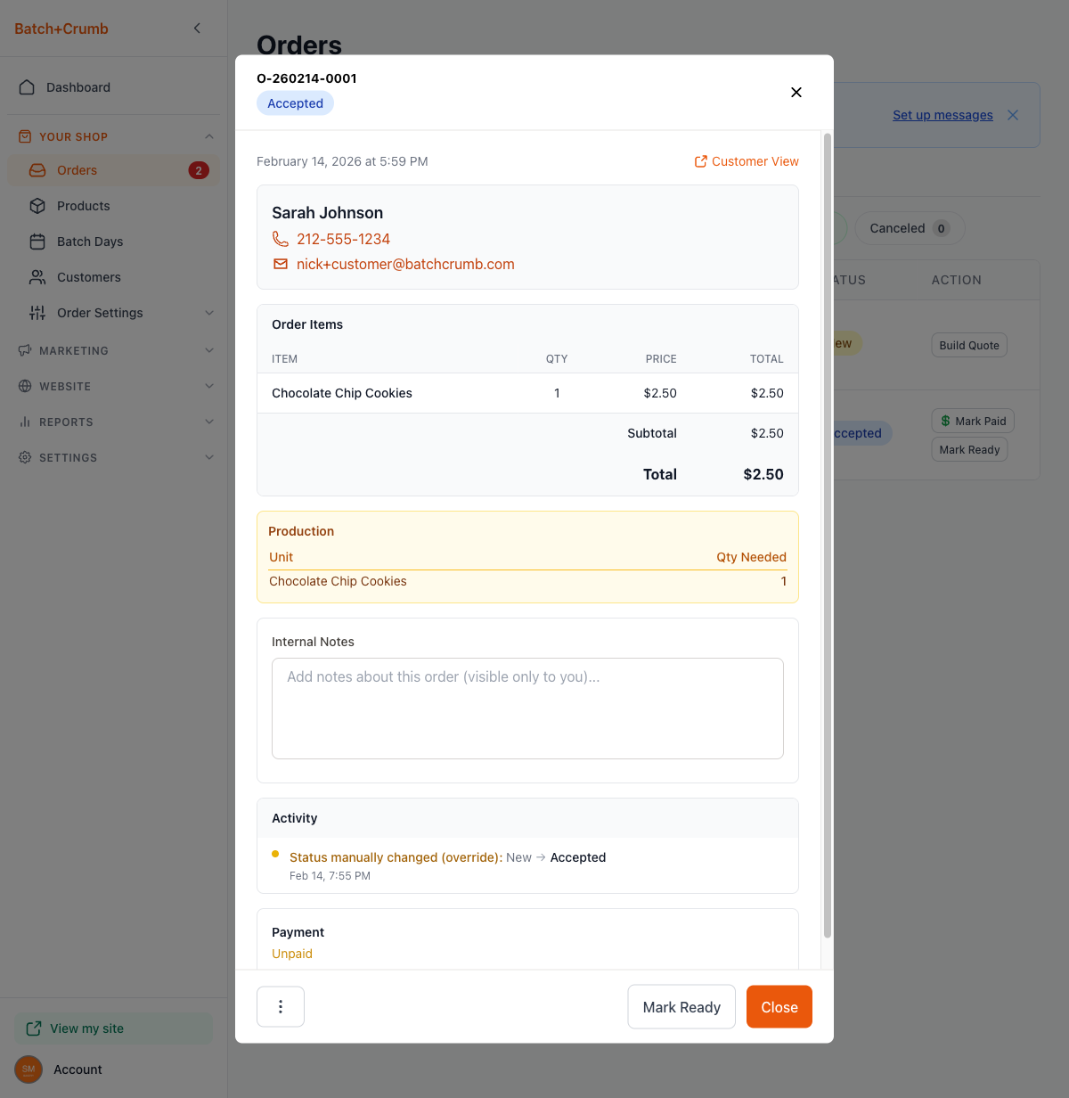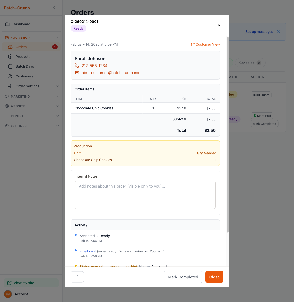 - Use the quick-action buttons (Mark Ready, Mark Completed) for your everyday workflow. They guide you through each step and prompt you to notify your customer.