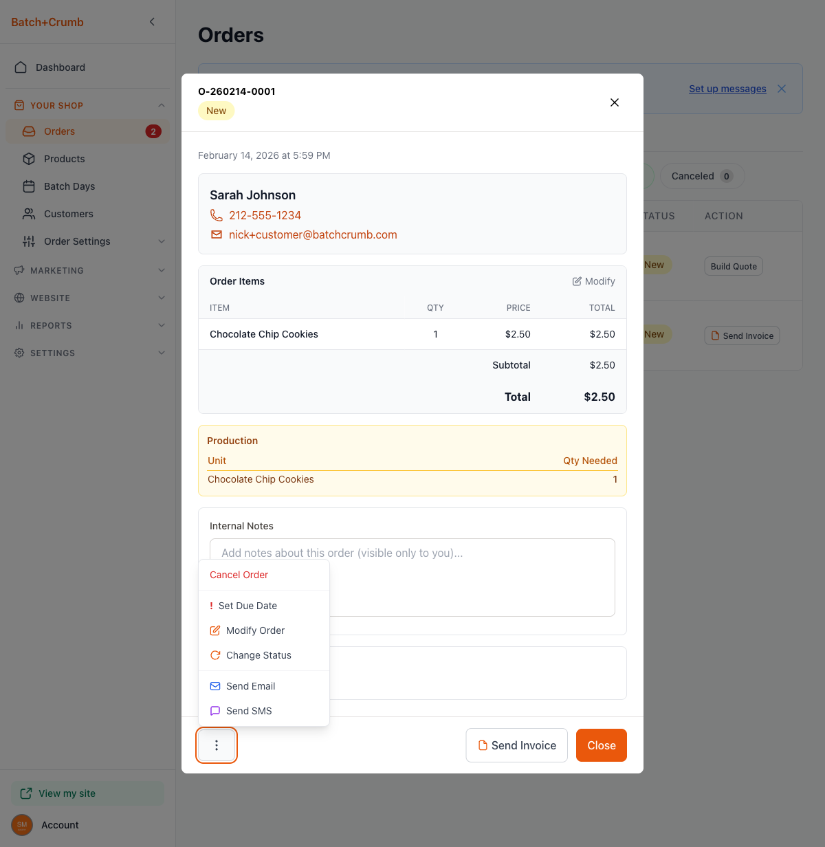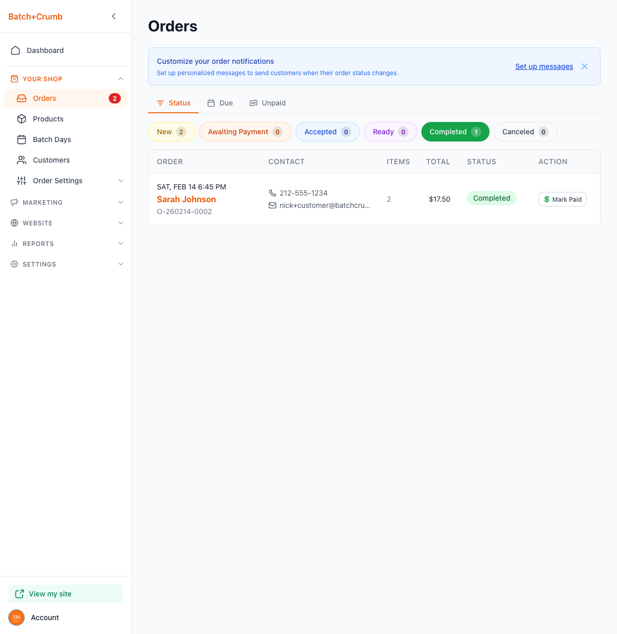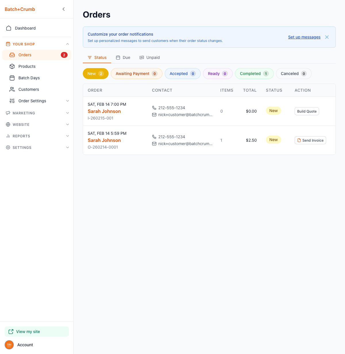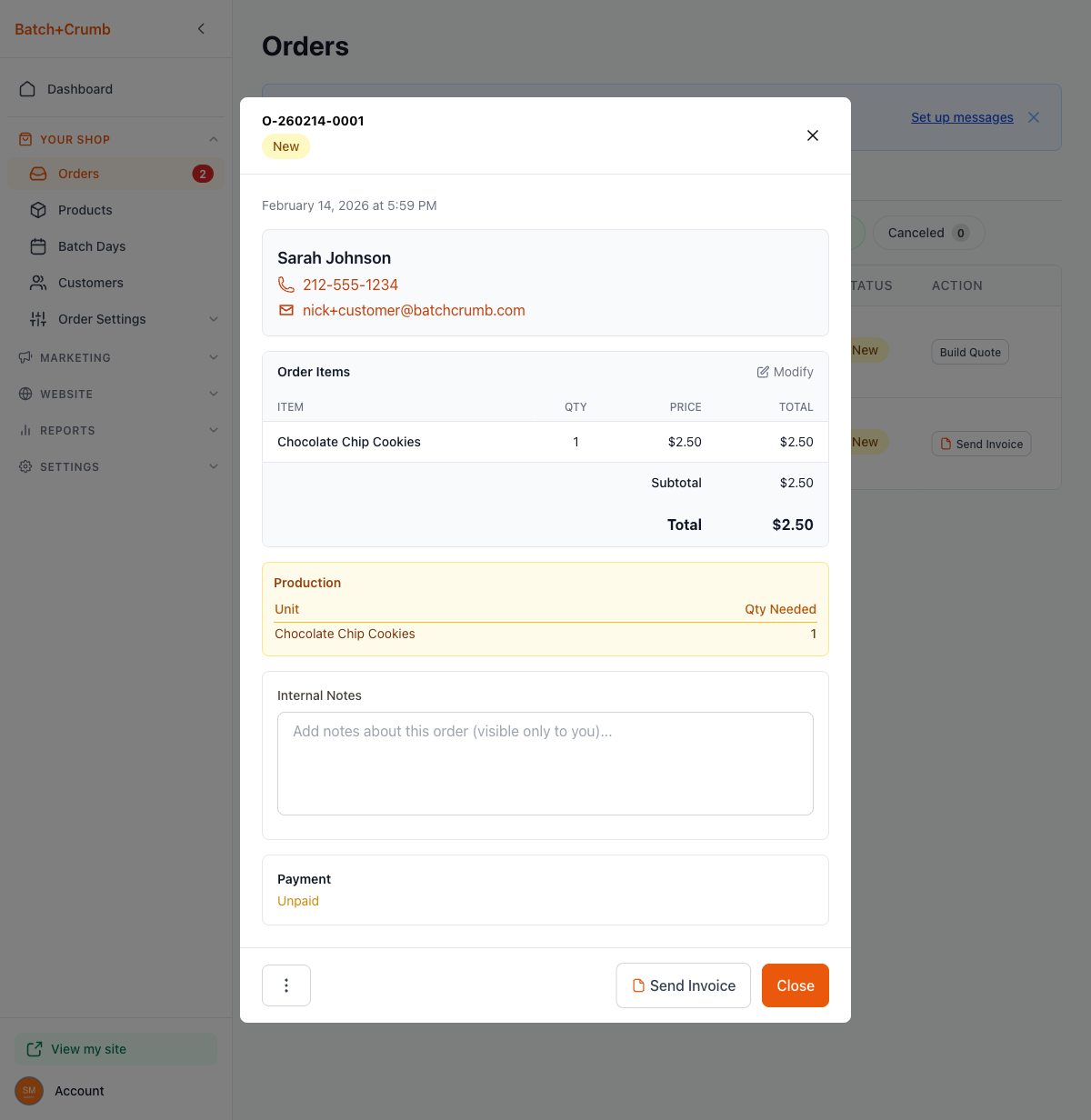 When a customer places an order through your shop, it shows up on the Orders page. This is your home base for staying on top of what needs to be baked, what's ready for pickup, and who still needs to pay. You can filter orders by status, view full order details, and take actions like sending invoices or updating statuses — all from one screen.