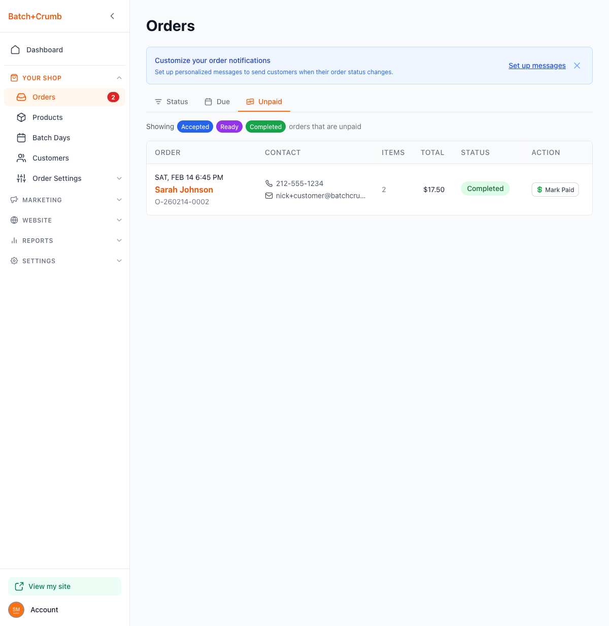 - Unpaid — Shows only Accepted, Ready, and Completed orders that haven't been marked as paid yet. A quick way to see who still owes you.