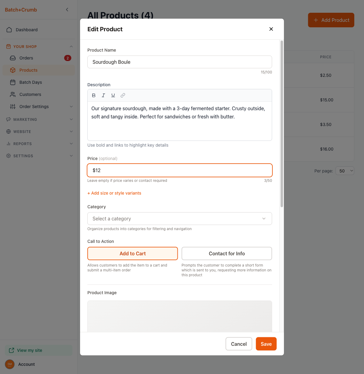 - Product Name — The name customers will see (up to 100 characters). Something clear and appetizing works best, like "Sourdough Boule" or "Chocolate Chip Cookies (dozen)."