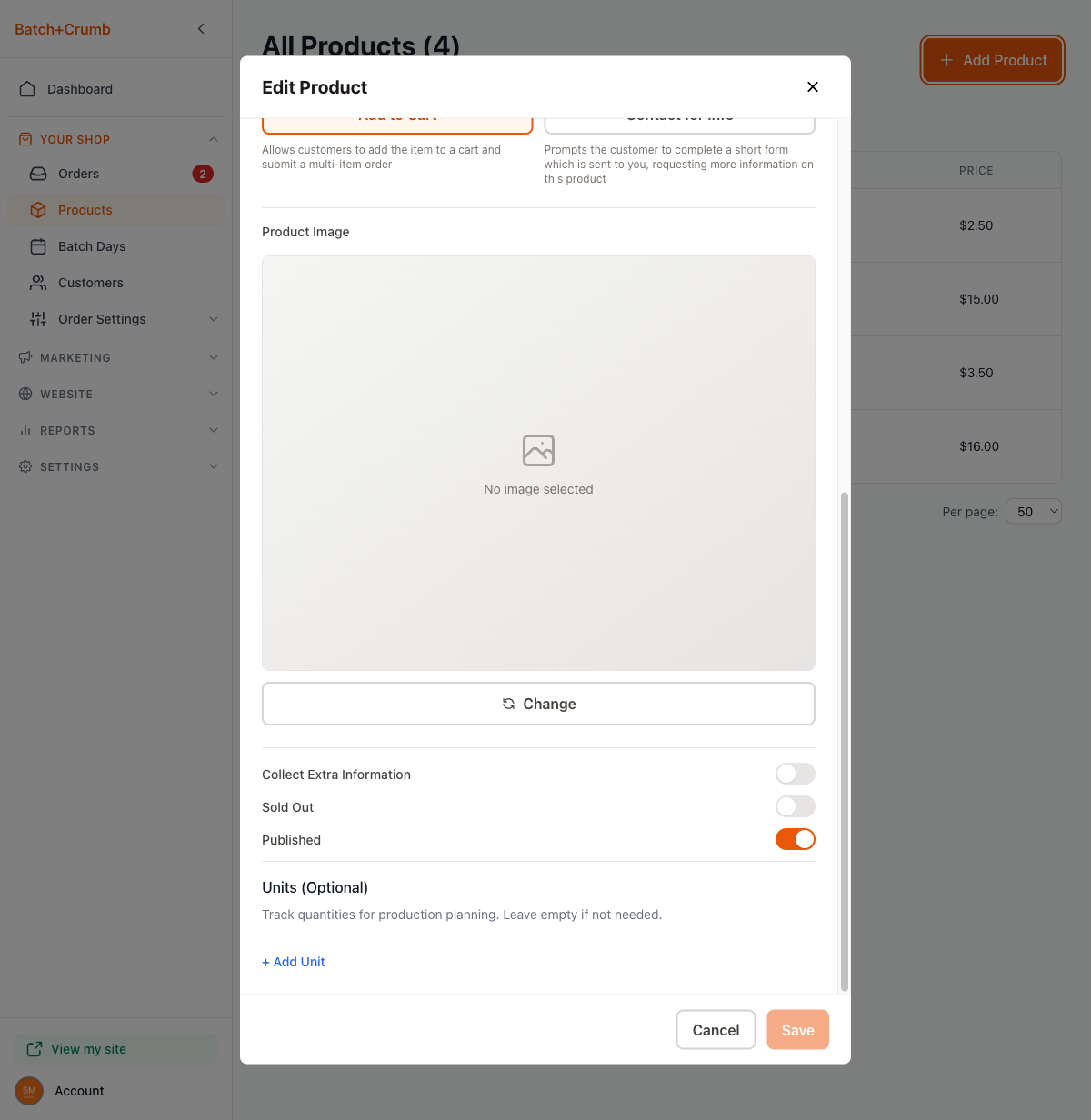 - Units (Optional) — If you want to track quantities for production planning, click + Add Unit to set up unit tracking. Most bakers can skip this.