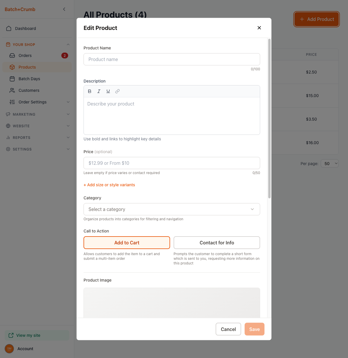 Your products are the heart of your Batch52 shop. Each product can have a name, description, photo, price, and a call-to-action button that lets customers either add it to their cart or contact you for more info. Adding a product takes just a couple of minutes.