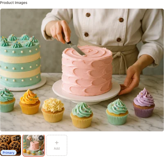To remove an image, click the × on its thumbnail. The first image in the row is always your Primary image — that's the main photo shown in your product list and shop.