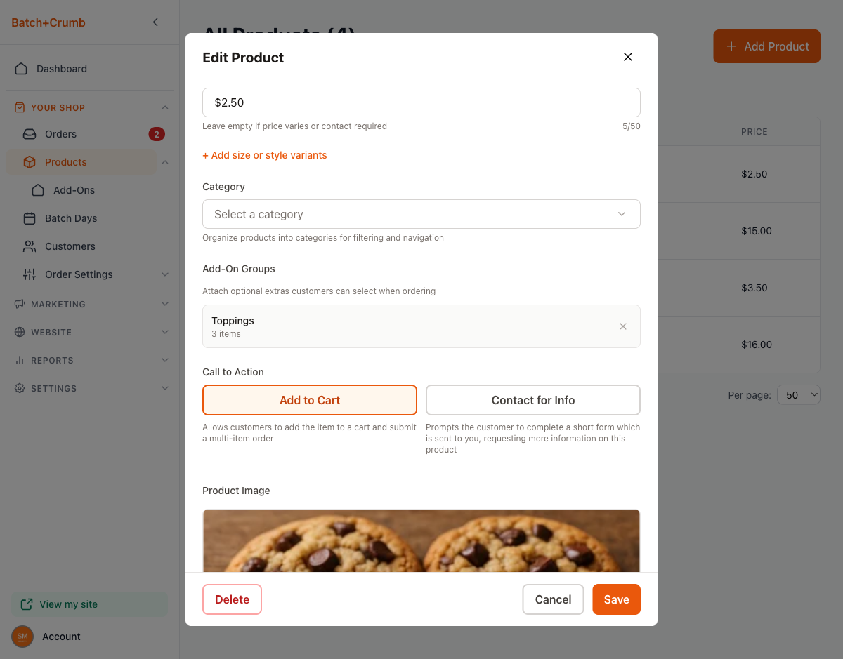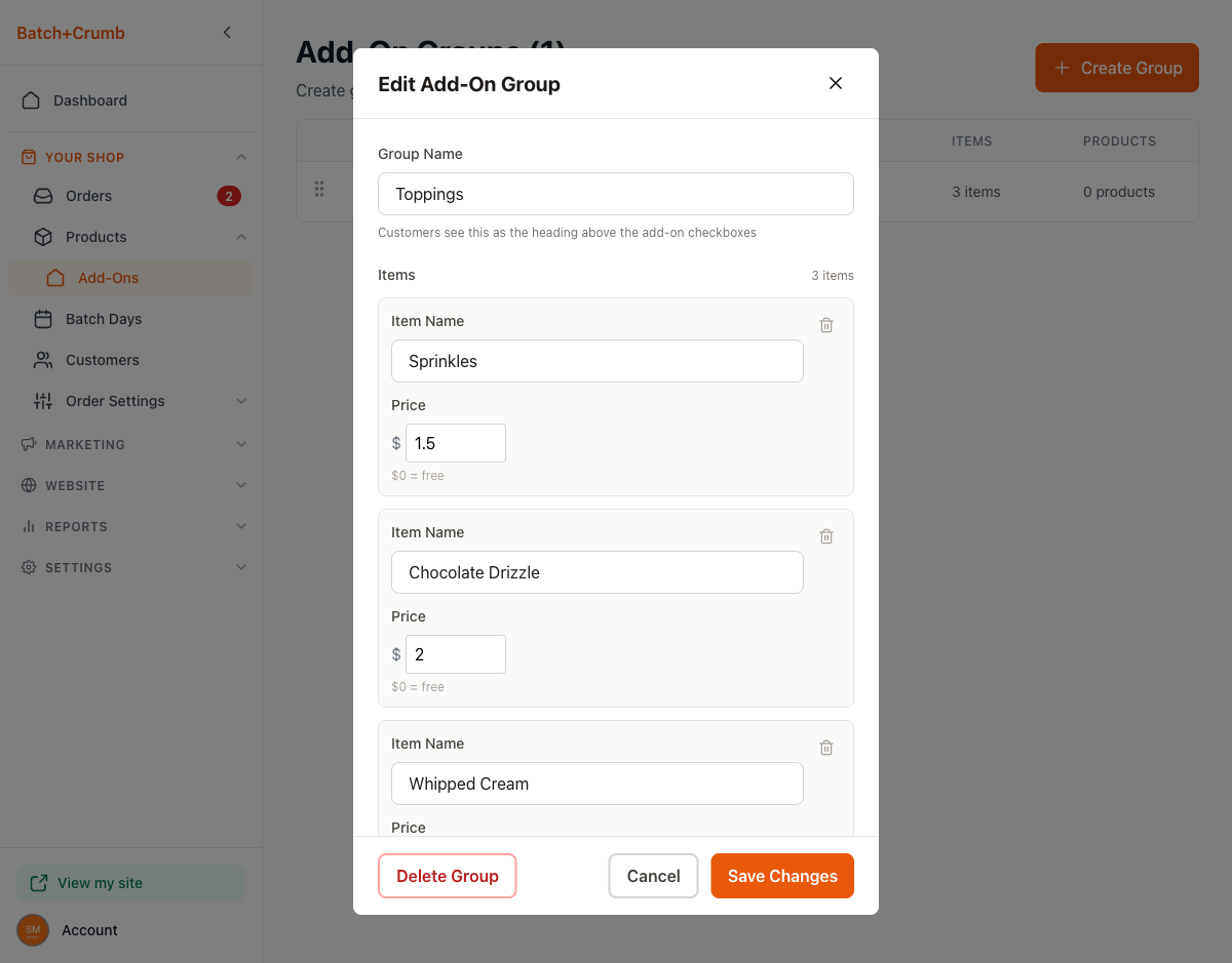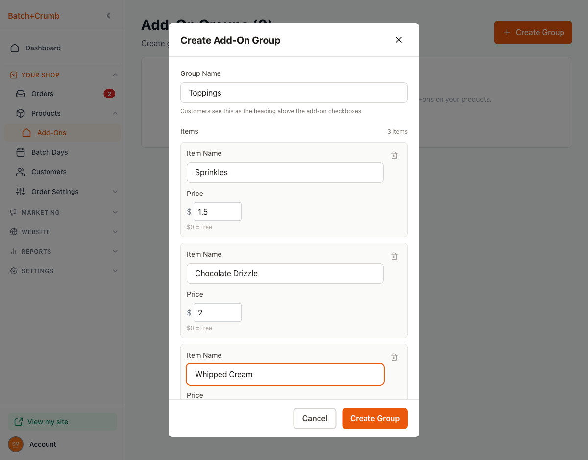 - Reuse groups across products. Create a "Toppings" group once and attach it to every cookie, cupcake, or cake that offers toppings — no need to recreate the same items for each product.