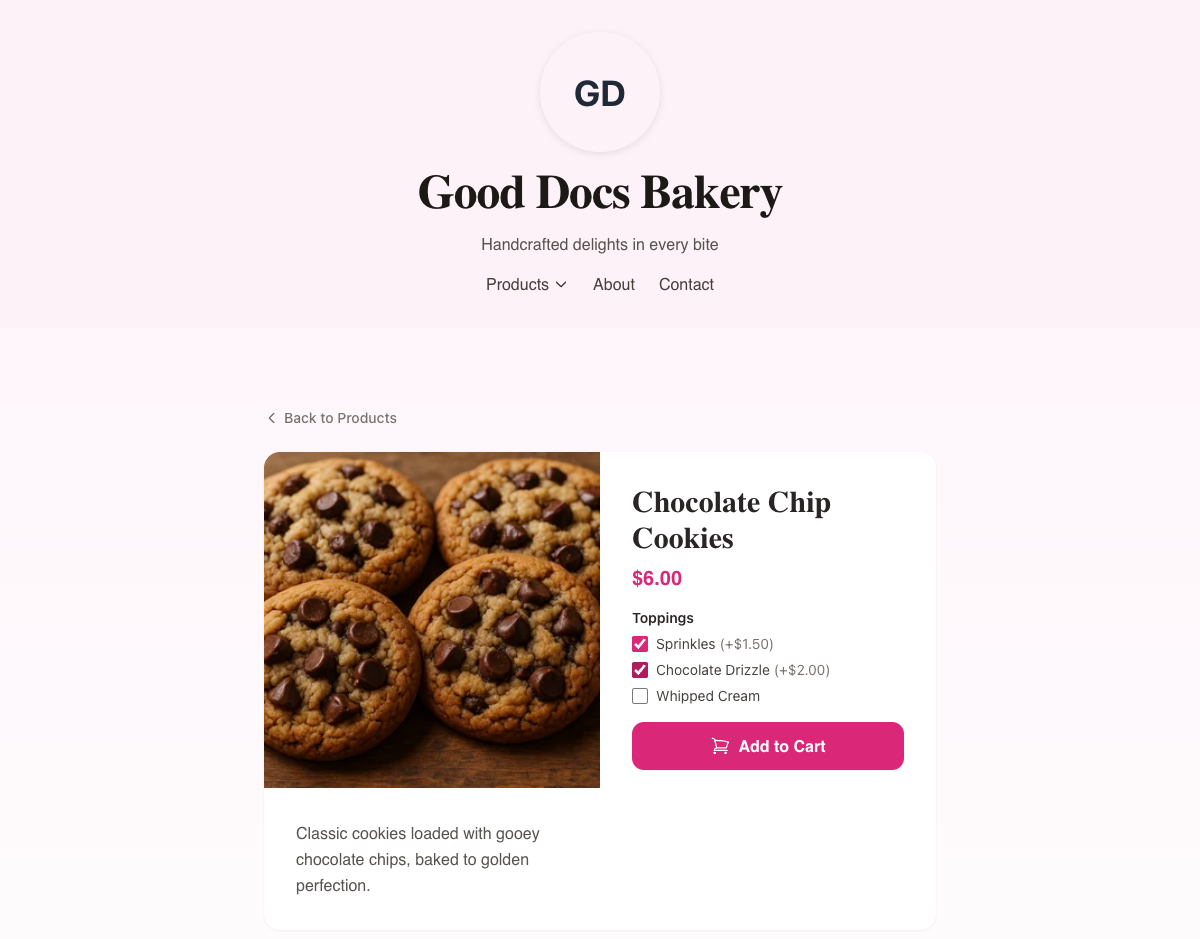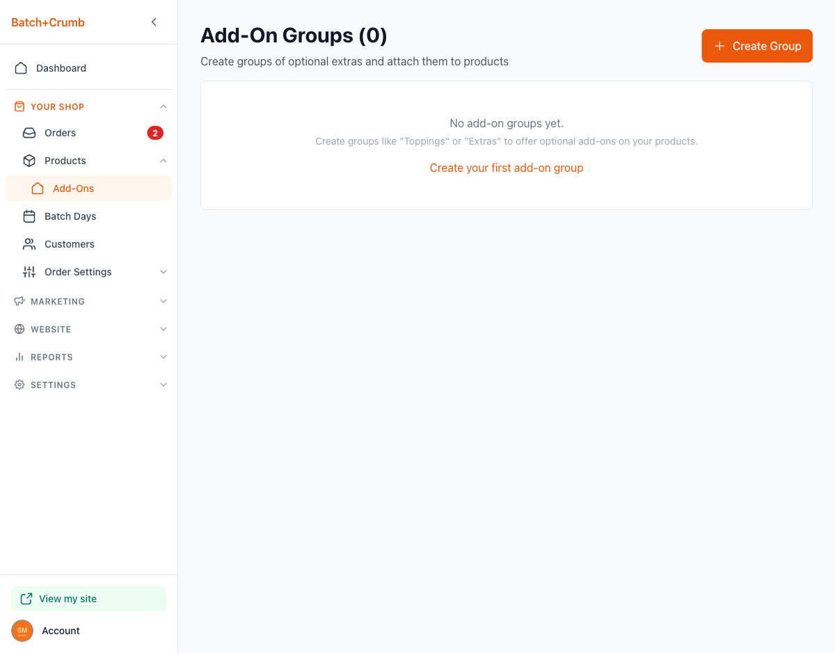 Add-ons let you create groups of optional extras (think "Toppings," "Extras," or "Gift Options") that customers can check off when ordering. You build each group once, then attach it to as many products as you like. When a customer selects add-ons, the price updates in real time so there are no surprises at checkout.