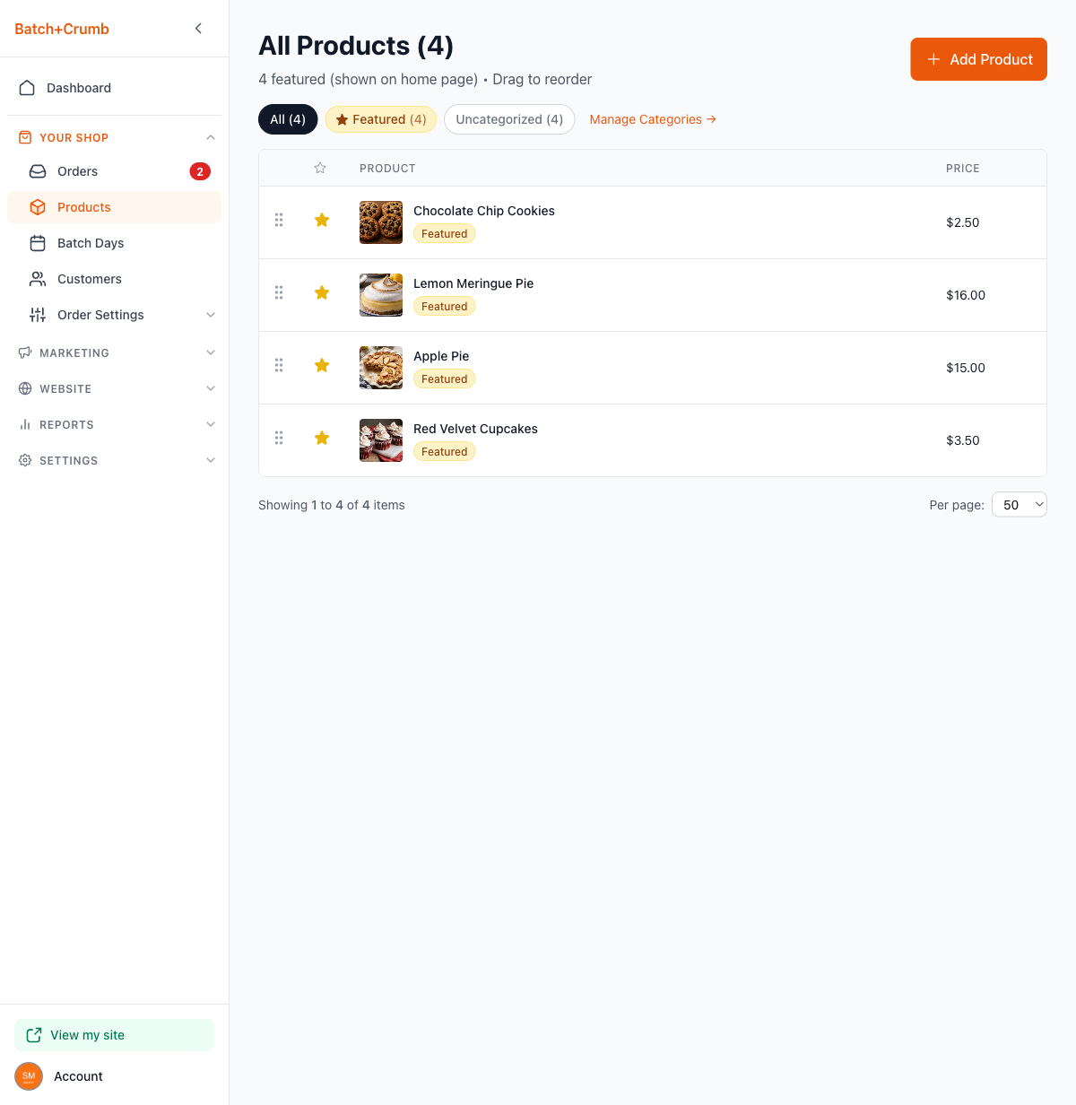 The order of products on your Products page is exactly the order your customers see when they visit your shop. If you just added a new seasonal item or want to put your best sellers front and center, a quick drag-and-drop is all it takes.