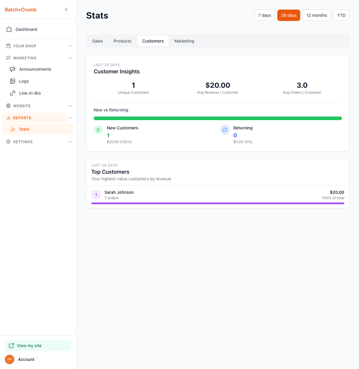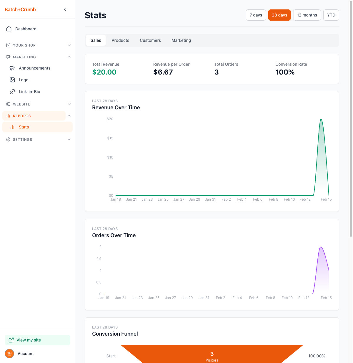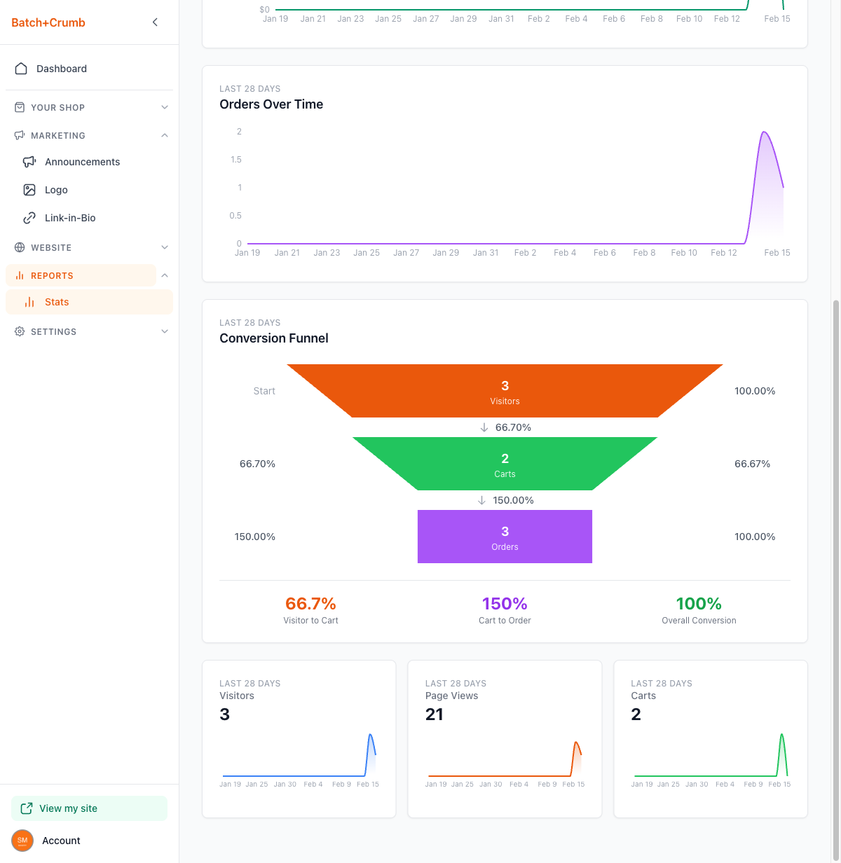 Your Stats page includes powerful performance metrics that go beyond basic sales numbers. The conversion funnel shows you exactly where visitors drop off — are they browsing but not adding to their bag? Adding to their bag but not checking out? These insights help you figure out what to tweak so more visitors become paying customers.