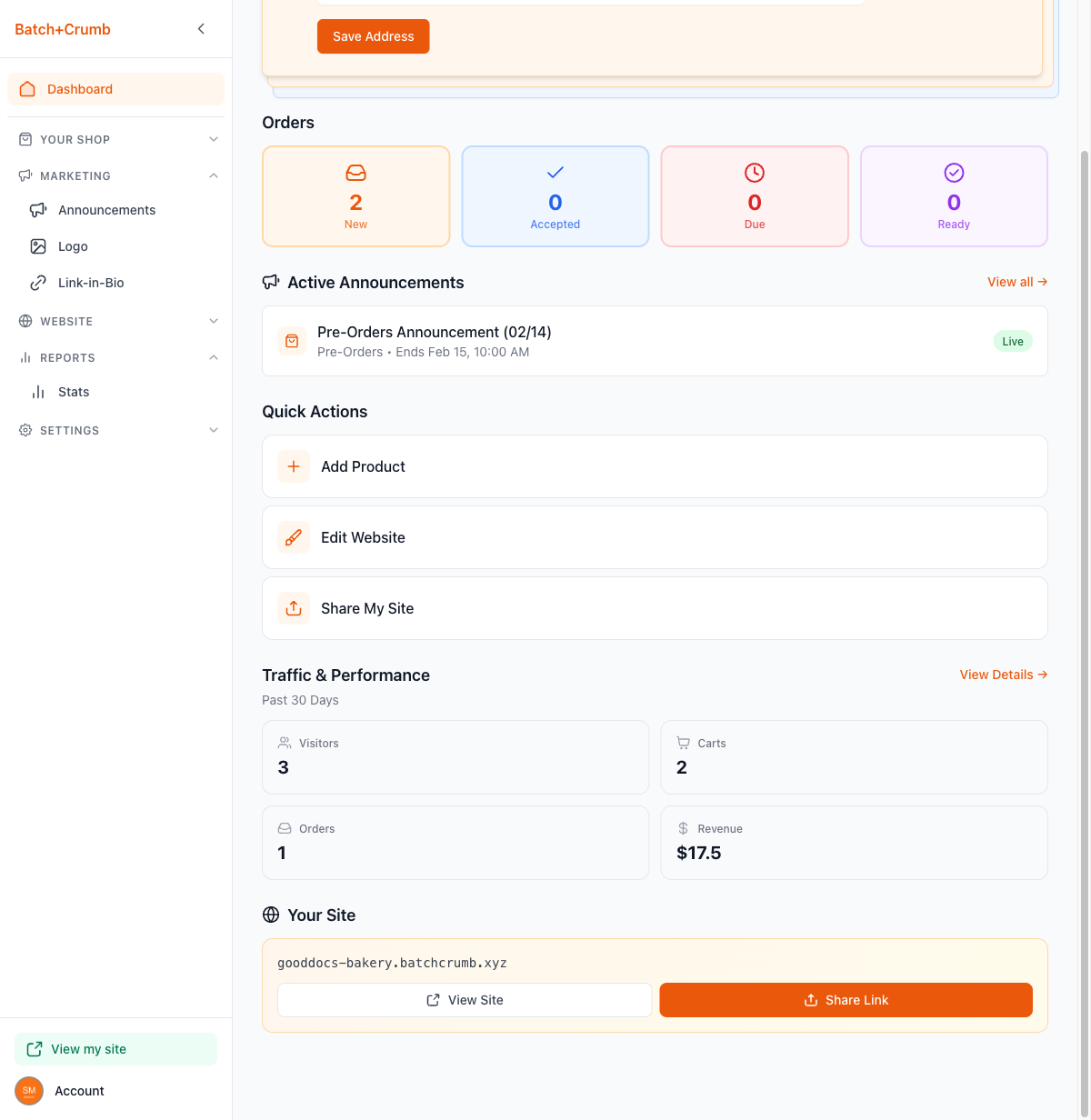 Your Dashboard includes a Traffic & Performance section that gives you a quick snapshot of the past 30 days — Visitors, Carts, Orders, and Revenue all at a glance.