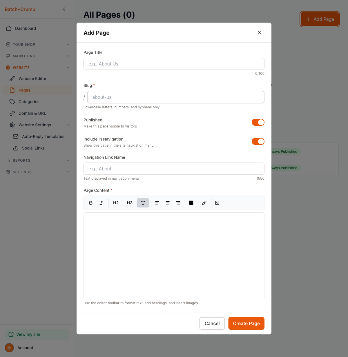 Fill in your page details and use the editor toolbar to format your content. You can make text bold or italic, add headings (H2 and H3), align text, change text color, add links, and insert images.