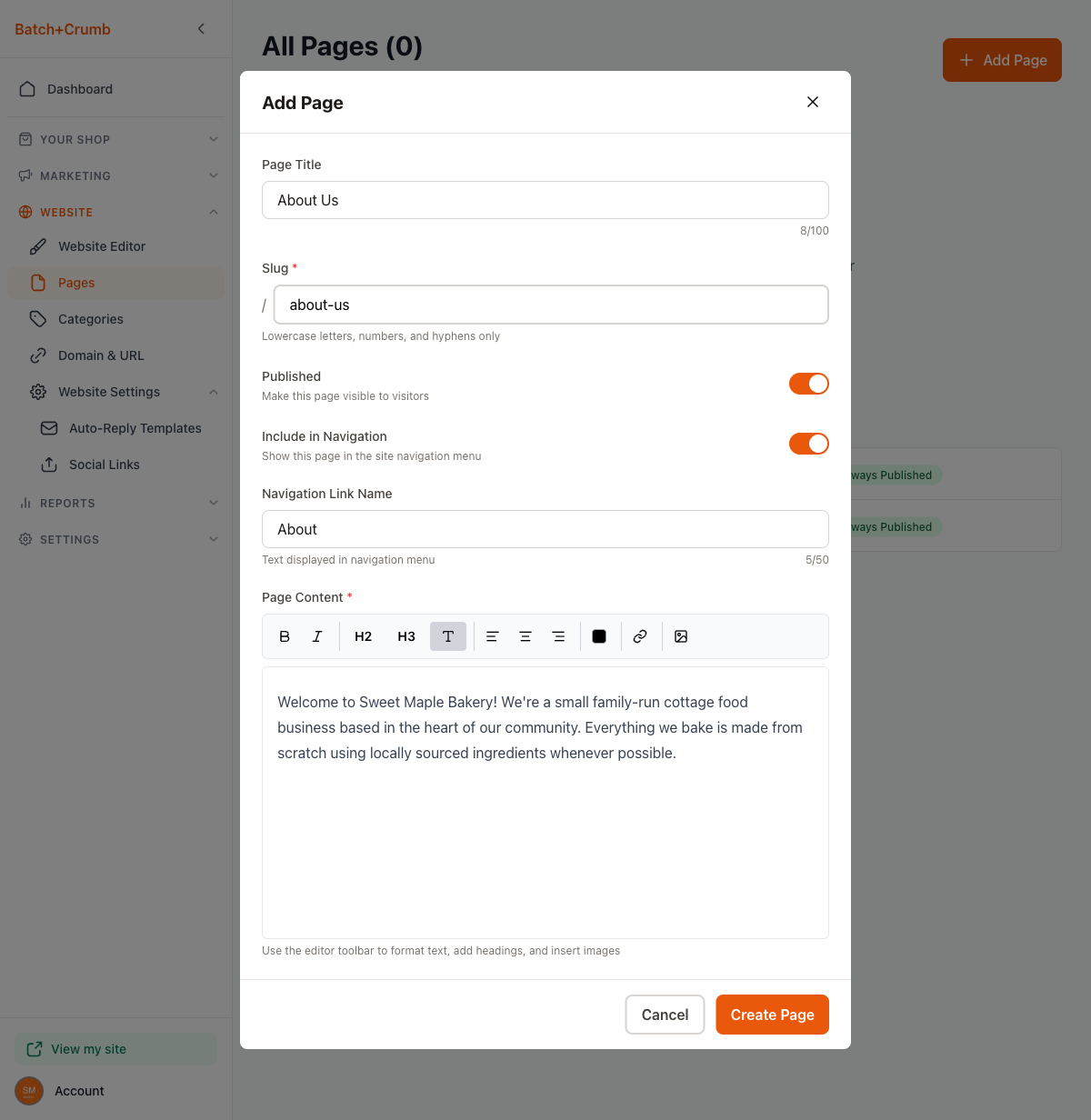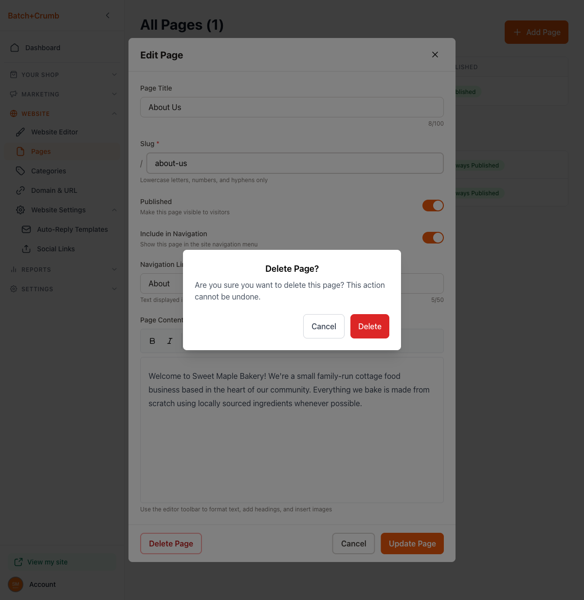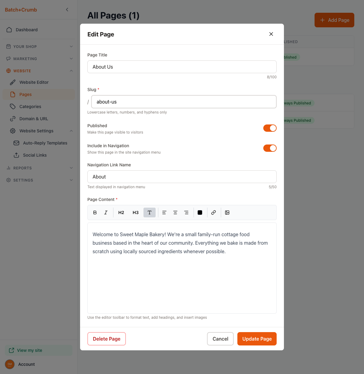 yourbakery.batch52.com/about-us), so keep it short and descriptive - You can unpublish a page without deleting it by toggling Published off — handy for seasonal content you want to reuse later