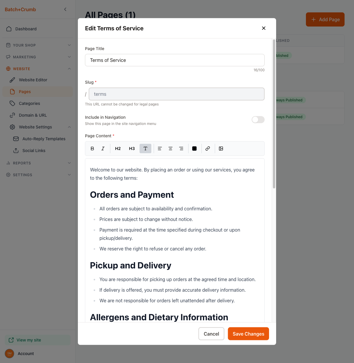 - Review the default Terms of Service and Privacy Policy to make sure they accurately reflect how your business handles orders, allergens, and customer data